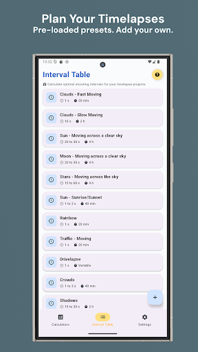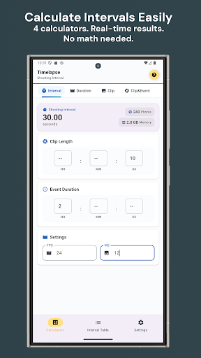 🎬 <b>延时摄影计算器 - 轻松规划延时摄影的利器</b><br><br>告别猜测延时摄影设置!这款免费的计算器应用让每个人都能轻松规划完美的延时视频。无论您是拍摄日落、云彩、城市交通还是植物生长,都能每次都获得合适的设置。<br><br><b>📱 一款应用,四种便捷计算器:</b><br><br>⏱️ <b>拍摄间隔计算器</b><br><br>• 找到延时摄影的最佳拍摄间隔<br><br>• 只需输入视频片段长度、事件时间、帧速率和图像尺寸<br><br>• 立即查看拍摄间隔、照片数量和所需内存<br><br>🎬 <b>事件持续时间计算器</b><br><br>• 不确定拍摄时长?精确计算<br><br>• 输入间隔和所需的视频片段长度<br><br>• 获取延时摄影的完美事件持续时间<br><br>📹 <b>视频片段长度计算器</b><br><br>• 想知道最终视频的长度吗?<br><br>• 输入拍摄间隔和事件持续时间<br><br>• 拍摄前预览最终视频片段长度<br><br>📸 <b>视频片段和事件计算器</b><br><br>• 快速计算视频片段长度和事件持续时间<br><br>• 灵感迸发时的完美选择<br><br>• 根据照片数量反向计算<br><br><b>📊 间隔表功能:</b><br><br>• 提前规划延时摄影项目<br><br>• 预加载常见延时摄影场景(日落、云彩、星空、交通)<br><br>• 轻松添加自定义事件<br><br>• 自然语言输入 - 只需输入“2 小时”或“10 秒”<br><br><b>✨ 主要功能:</b><br><br>• 实时计算 - 结果随输入实时更新<br><br>• 简单易懂的界面<br><br>• 内存使用量估算(MB/GB)<br><br>• 照片数量计算<br><br>• 简洁的 Material 3 设计<br><br>• 支持深色/浅色主题<br><br>• 注重隐私,提供授权管理<br><br>• 无需网络连接 - 可离线使用<br><br>• 适用于任何 Android 设备<br><br><b>🎯 完美适用于:</b><br><br>•适合以下人群:摄影爱好者,开始尝试延时摄影<br><br>• 热爱自然,拍摄日落、日出或云彩的摄影师<br><br>• 拍摄城市交通或建筑工地的摄影师<br><br>• 从事创意项目的学生<br><br>• 任何对延时摄影感兴趣的人<br><br><b>💡 简单提示:</b><br><br>• 使用间隔表学习常用的延时摄影设置<br><br>• 尝试 24 fps 以获得流畅的视频,30 fps 以获得标准视频<br><br>• 更大的图像需要更多内存<br><br>• 从较短的拍摄时间开始练习<br><br><b>🚀 您会爱上延时摄影计算器的原因:</b><br><br>✅ 4 种计算器,满足各种延时摄影场景<br><br>✅ 实时计算 - 无需等待<br><br>✅ 内存预估帮助您规划存储空间<br><br>✅ 带有预设的间隔表<br><br>✅ 自然语言输入 - 输入“2 小时”而不是数字<br><br>✅ 简洁现代的设计,任何人都能轻松上手<br><br>✅ 深色模式,适用于弱光环境<br><br>✅ 离线使用 - 无需网络连接<br><br>✅ 隐私至上<br><br>✅ 免费使用,无需注册<br><br><b>💎 升级到专业版 - 无广告,升级到 Timelapse Calculator PRO,即可享受完全无广告体验。点击应用内的“升级”按钮即可开始。<br><br>🔗 关于我们的计算器:<br><br>我们的计算器使用简单且经过验证的公式。只需输入视频片段长度、事件持续时间、帧速率和图像尺寸,即可立即获得准确的拍摄间隔、照片数量和内存需求。无需复杂的设置或数学运算!<br><br>⬇️ 立即下载 Timelapse Calculator:<br><br>加入成千上万使用 Timelapse Calculator 规划精彩延时视频的爱好者行列。它免费、简单易用且效果显著。<br><br>💬 反馈与支持:<br><br>有任何建议或发现错误?请通过应用联系我们。我们会阅读每一条消息,并不断改进!</b>