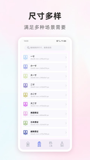 专业智能证件照拍摄制作 一款可以自己制作证件照的照片处理工具,拥有百种证件照尺寸规格,可以一键美颜告别素颜拍照尴尬,智能替换高级色背景,各种男装、女装、童装、正装随意搭配。 一款功能强大的专业证件照制作软件,集无水印保存、换底色、换服装、人工修图、在线冲印等功能于一体,满足用户全场景使用需求。 满足对证件照的一切需求,更快捷高效的用手机制作证件照。 有着规格人性化、拍摄多样化、美颜自然化、操作智能化等一系类特色功能,而且无需再次查询尺寸,直接在线裁剪即可完成。 一寸、二寸等常用寸照,采集证件照,结婚证照片、身份证照片、学籍证件照片、考试证件照片、简历照片、名片照片等数百种证件照尺寸格式都能得到满足!支持自定义规格,文件大小,分辨率,任意规格轻松获取。 系统一键更换多种底色,操作简单省事。同时,除了红底、白底、蓝底等常规色以外,更有高级色、马卡龙、渐变等个性化底色可供选择,满足多元风格需求。 提供职业西装、衬衫等正装,男装、女装、童装素材齐全。满足多种场景需求的同时,支持自助调节服饰大小和位置,搭配消除笔调整细节。