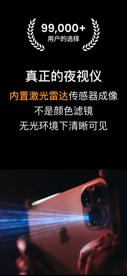 夜视仪是一款能在完全黑暗环境中拍摄和录像的 App,充分利用 iPhone 和 iPad 的激光雷达扫描仪与原深感摄像头技术。与其他夜视 App 不同,它借助设备内置的深度传感器扫描周围环境,生成真实的夜视画面,远超普通相机滤镜的模拟效果。 【功能介绍】 - 多摄像头切换:自由切换激光雷达、TrueDepth 传感器和普通摄像头,满足不同场景需求 - 拍摄录制:可拍摄 "激光雷达图像"和录制"激光雷达视频",并保存到系统相册 - 距离测量:实时测量目标与设备之间的距离,探索空间深度 - 实时推送:实时推送夜视画面到 Apple Watch、手机、平板和电脑,随时随地查看精彩瞬间。 【原理】 在光照充足环境下同时使用后置普通摄像头和激光雷达扫描仪/原深感相机联合成像,以保证图像质量;在完全无光环境下只使用后置激光雷达扫描仪/原深感相机成像。 【支持的设备】 所有配备了激光雷达扫描仪或具有 Face ID 功能的 iPhone 和 iPad。 【自动订阅服务说明】 订阅后可解锁全部付费功能,并持续获得后续高级功能更新。 确认购买后,订阅会通过你的 Apple 账号自动续订。到期前 24 小时内将自动扣费,成功扣费后订阅将延长一个周期。如需取消自动续订,请在当前订阅到期前至少 24 小时,于 Apple ID 设置中手动关闭自动续费。是否取消续订由你自行决定,未取消即视为同意进入下一计费周期。 隐私政策:https://night-vision-web.netlify.app/en-us/privacy-policy 使用条款:https://www.apple.com/legal/internet-services/itunes/dev/stdeula 【联系我们】 邮箱:darkce97@gmail.com