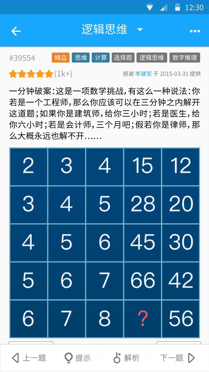 拥有海量中文智力题库,每日智力题更新,包含各类逻辑游戏、侦探推理题目、门萨智商测试题、疯狂猜成语、儿童脑筋急转弯大全、恐怖漫画馆、趣味数独世界、小学奥数等烧脑益智题。通过各类有趣的猜谜问答游戏训练你的思维,让你越玩越聪明!<br> <br>智力题库每日更新,超过十万道的侦探推理题和逻辑思维训练题,烧脑益智学知识!<br>智力题目解析详细,让你看得明明白白!<br>智力题目多年龄覆盖,适合各个年龄用户大脑开发及逻辑思维训练。<br>权威智商测试评测,五大能力追踪智力成长。<br> <br>你想像福尔摩斯一样拥有超强侦探推理能力么?<br>你想像侦探可能一样拥有敏锐的逻辑思维能力么?<br>你想加入门萨会员,成为高智商俱乐部一员么?<br>赶紧下载33IQ,把思维训练装进你的口袋!<br> <br>人思考时,大脑释放的能量可以点燃一盏灯。<br>33IQ网微博:http://weibo.com/u/2001571267 <br>33IQ网微信:33IQ网 <br><br>33IQ让你越玩越聪明!