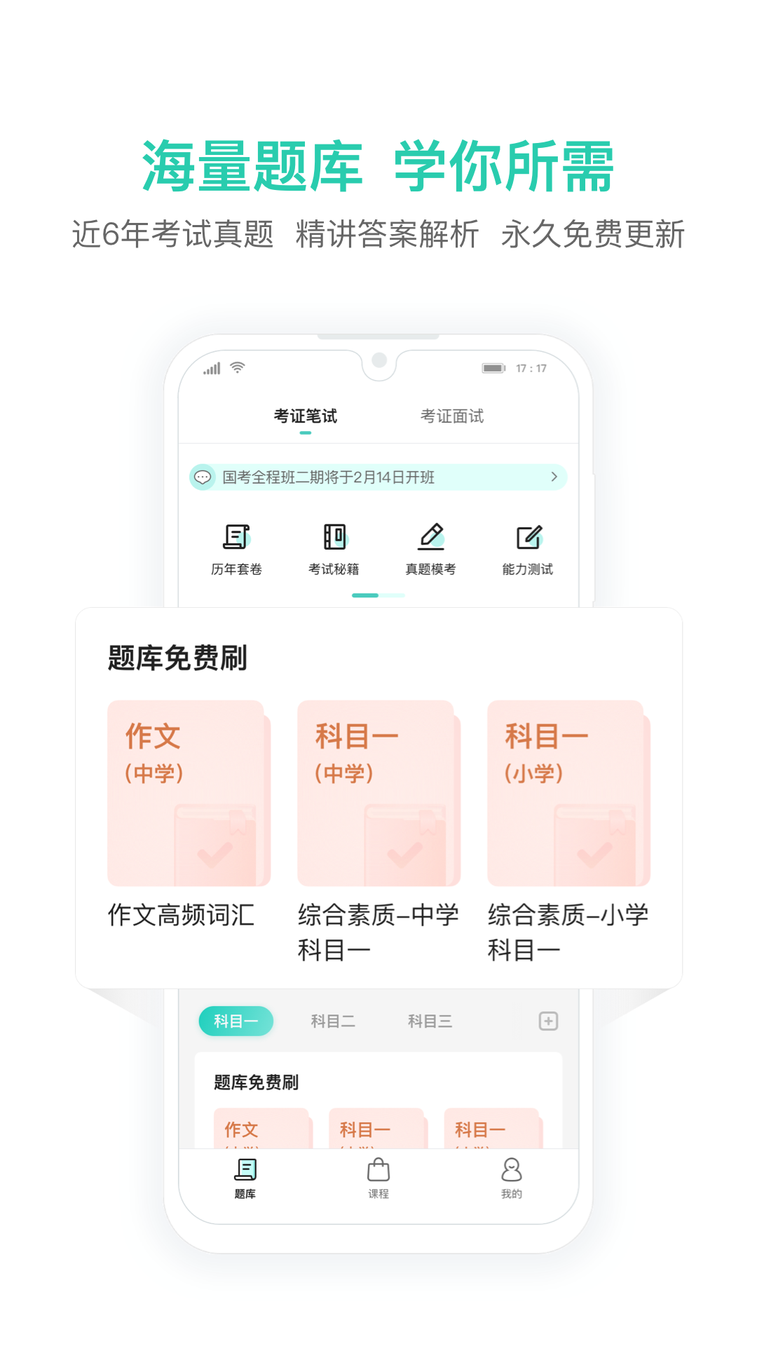 教考领域深耕10年,是你信得过的教资备考app! 免费直播课程,真题精师解析,下载就送! 刷题攻考点,游戏化闯关,助考生轻松记忆! 笔试面试二合一,科学高效备考教师资格证教师招聘! 精心打造的高品质教师资格证、教师招聘考试备考应用! 由17学堂出品 【25年,考证考编一起通关】 教师资格证考试:笔试涵盖幼儿、小学、初中、高中综合素质+保教/教育/教育教学知识与能力+专业课,面试涵盖结构化+试讲+答辩。 教师招聘考试:笔试涵盖多省市教育综合知识+公共基础知识+专业课,面试涵盖说课+试讲。 【25年,不止游戏化学习】 25年全面改版升级,紧贴考试大纲,告别传统枯燥的学习方式,给你带来优质的学习体验! 【25年,邀您免费看直播】 下载一起考教师APP—点击免费直播—选择考试目标—免费看直播课 和蔼可亲的长腿欧巴每周与您相约17公开课,超多干货满足好学的你^-^ 【25年,一起移动学习】 题库、直播课都支持在线使用,移动学习更加给力! 更多考试资源,请关注 新浪微博@一起考教师 微信订阅号“一起考教师” 微信服务号“17学堂”(yqxuetang)