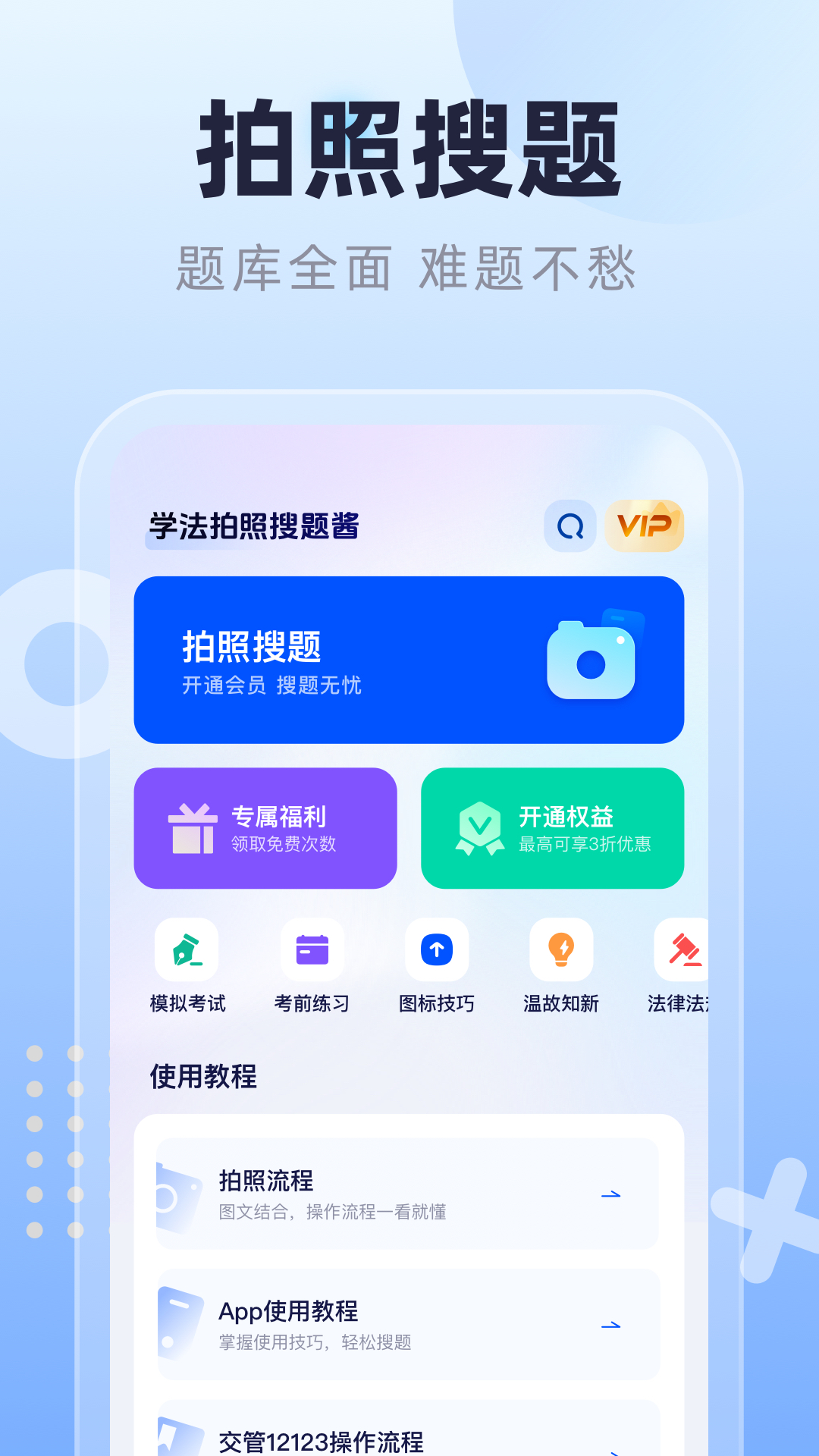 学法拍照搜题酱是一款辅助驾驶员学习交通安全知识、掌握交通法规考试题库的学习工具。 APP提供拍照搜题、文字搜题、考前练习、模拟考试等功能,实时同步更新相关考试题库,覆盖2025年新规内容,帮助用户更高效地学习和掌握知识点。 【拍照搜题】 一键拍照即可搜题,快速准确,帮助用户在学习过程中更好地理解题目,提高学习效率。 【产品特色】 拍照搜题:实时更新各地区题库及解析,准确率高,搜题速度快。 模拟考试:仿真模拟考试环境,助力用户提前熟悉考试流程。 考前练习:结合大数据出题,涵盖小车、客车、货车、摩托车等全类型题库。 学习指南:提供热门答疑,帮助用户快速了解相关学习与考试信息。
