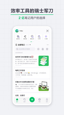 印象笔记是全球闻名的效率软件和知识管理工具。作为你的第二大脑,印象笔记可以帮助你简化工作、学习与生活。你可以在手机、电脑、平板、网页等多种设备和平台间,无缝同步每天的见闻、灵感与思考。一站式完成知识信息的收集备份、高效记录、分享、多端同步和保存。“An elephant never forgets” (大象永不遗忘)。 小米【金米奖】获奖应用 【AI语音笔记】 - 短语音速记与会议、课程等长语音录制 - 大模型自动转写、智能润色与摘要 【多端同步】 - 手机、平板、电脑、网页等多平台同步使用 - 知识信息保存,随时随地查看 【信息收集】 - 集中收藏来自微信、微博等的多种优质内容 - 使用印象笔记·剪藏,剪藏网页图文内容 - 拍照扫描书籍、纸张、板书和名片等,将信息数字化保存 - 使用 OCR 文字识别功能,识别并保存图片中的文字 【高效记录】 - 使用笔记本组和标签,打造专属知识库 - 笔记中支持插入 Office、PDF、图片、音频等几乎所有常见文件 - 一键应用笔记模板,提高记录效率 【分享协作】 - 通过微信、微博等方式与好友分享笔记内容 - 与团队共享笔记和笔记本,共享知识高效协作 - 工作群聊帮助团队围绕笔记讨论,快速推进项目 【任务清单】 - 把知识信息转化为行动,让知识产生更大价值 - 创建清单,便捷管理待办事项,保持专注与高效 - “今日/未来7天/已完成/待整理”等视图,帮你管理时间 【更多特色功能】 - 设置密码锁定,加强笔记隐私 - 长按大象图标,开启速记/录音/拍照和搜索功能 - 添加印象笔记桌面插件,一眼查看笔记和提醒 - 使用「印象笔记-剪藏」,像剪报纸一样收藏网页内容 - 微信微博关注「我的印象笔记」,一键收藏精彩内容 - 微信微博关注「印象笔记」,获悉更多新鲜好文 -----你可以用印象笔记做什么------ 【上班族】 - 将工作日志、会议记录、文档附件通通保存到云端,工作资料触手可得 - 扫描合同、名片,OCR批量数字化纸质文件、备份工作资料 - 上百种预置模板,助你轻松完成周报、总结、OKR进度管理 - 多人多屏动态协同编辑,打破远距离办公的低效率 【学生党】 - 清晰拍照课堂板书、批量扫描纸质笔记,复习时资料通通找得到 - 录音实时转文字,老师讲课内容一字不漏,还能在时间轴上添加批注 - 一键转存微信群文件、课件,再也不怕文件过期 - 手写标注PDF文档,记录你的思考 【生活家】 - 创建购物、电影清单,轻松安排日常生活 - 用图片、文字记录亲子、好友、宠物的美妙瞬间 - 轻松聚合微信、微博、新闻客户端和网页信息,随手捕捉每一寸灵感 --- 升级 印象笔记 高级帐户,解锁更多强大功能: - 每月上传流量10GB - 同步所有设备,无拘无束 - 离线访问笔记,无网络也能随意访问笔记 - 轻松保存邮件及其附件 - Office 文档和PDF中的文字均可搜索 - PDF文档标注功能 - 智能名片扫描 --- 隐私 https://www.yinxiang.com/legal/privacy.php 服务条款 https://www.yinxiang.com/legal/tos.php 【联系我们】 微信公众号&客服通道 @印象笔记 微信服务号@我的印象笔记 微博@印象笔记 微博服务号@我的印象笔记 关注印象笔记,获取更多高效指南 微信视频号@印象笔记 Bilibili @印象笔记