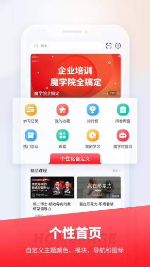 魔学院是面向企业的移动学习和培训管理云平台,全面支持App、微信、企业微信、钉钉、PC、TV,并可以无缝集成到企业的IT系统或第三方平台。 员工端 一、 课程与考试 1、可对课程评分、评论、收藏。 2、支持分享到朋友圈、微信好友、微博等。 3、支持课程缓存,实现离线学习。 4、支持在线答题,可查看正确率、成绩排行等。 二、 任务中心:可查看企业分配的课程、考试及线下活动等。 三、 社区:可发起任意话题,可匿名、点赞、评论、@学员。 四、 个人中心: 1、 可查看学习记录、所获证书与勋章等。 2、 可设置学习提醒,定时提醒学习。 3、 支持第三方账号绑定、语言切换等。 五、 大加号功能:员工一键上传课程,支持第三方链接或图片文字编写。 管理端 一、 组织信息与架构 1、 支持修改企业信息、上传logo、设置三级域名。 2、 可进行多部门的新增、编辑、删除等。 3、 可excel表一键导入员工信息,支持员工账号的增、修、删。 4、 可设置多个不同权限的管理员。 二、 培训管理:制定培训计划,包括新员工培训、岗位技能培训、资格认证培训、其他培训等。 三、 课程中心 1、 课程格式支持:MP4、MP3、PPT、PPTX、doc、docx、pdf、H5、第三方链接等视频和文档。 2、 线下活动:线下参加,线上通知、统计。可设置主题、讲师、活动时间、活动地址、活动针对对象等。 四、 考试中心 1、 考试管理:指定部门/员工发布考试任务;设置考试及补考时间。 2、 题库管理:批量管理试题,支持单选题、多选题、是非题、填空题、问答题。 五、 统计中心 1、 综合统计:平台活跃度等,数据可导出。 2、 培训统计:培训名称、场次以及参加人员等。 3、 课程统计:课程点击量、学习人数及完成率等。 4、 考试统计:考试场数、试卷和题库总量等。 5、 员工统计:员工学习课程数、考试合格率等。 6、 部门统计:部门学习完成数、部门考试通过率等。