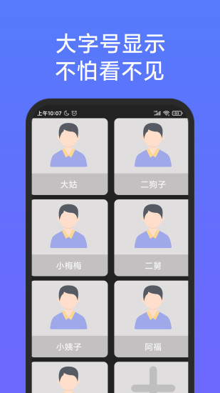 极大显示,让爸妈看得清 专为爸妈设计的桌面,大字体、大图标,大色块,无论短信、通讯录一律超大,让爸妈扔掉老花镜。 极简输入,让爸妈用的嗨 对着手机说话,语音识别成短信文字,让不会用输入法的爸妈也能轻松发短信。 极简定制,给爸妈最方便 可按自己意愿,将联系人直接放到桌面,比任何智能通讯录都智能,电话短信,点击就用,真是方便到家了。 极简读信,为爸妈读出来 来了短信,可以语音读出来,听短信,真省心,就像小时候爸妈为我们讲故事。 极大头像,如在爸妈身边 联系人极大头像,看照片打电话,我们仿佛就在身边,好亲切。 极简锁定,让爸妈没顾虑 可以锁定桌面编辑功能,可以锁定应用栏,避免爸妈误操作、误删除。 极大锁屏,为爸妈想的全 大字体的锁屏,实时天气,天气、日历信息首页大屏显示随时查看