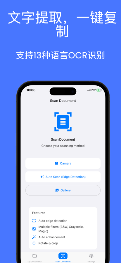 Turn your iPhone into a powerful document scanner. Scanner lets you capture documents, receipts, business cards, and notes in seconds, then export them as high-quality PDFs with digital signatures. **Scan Smarter** Point your camera at any document and Scanner automatically detects the edges and crops the image perfectly. No fuss, no manual adjustments. Import existing photos from your gallery just as easily. **Powerful Filters** Choose from four image modes to get the perfect result every time. - Original: Keep the photo exactly as captured. - Black and White: High-contrast output ideal for printed text. - Grayscale: Clean, neutral tone for mixed content. - Magic: Adaptive enhancement that boosts clarity and removes shadows automatically. **On-Device OCR Text Recognition** Extract text from any scan using Google ML Kit, which runs entirely on your device. No internet connection required. Supports English, Chinese, and Japanese out of the box. Copy, search, and share the extracted text in seconds. **PDF Generation with Digital Signatures** Generate a professional PDF from any document with a single tap. Before exporting, you can draw and embed your own digital signature directly on the PDF. Perfect for contracts, forms, and official documents. **Organize Your Documents** All your scans are stored locally in a clean, searchable document library. Rename documents, add more pages, rotate individual pages, and reorder content at any time. Search by document name or OCR text to find what you need instantly. **Share Instantly** Share any document as a PDF, as individual images, or as plain text. Compatible with AirDrop, email, messaging apps, and any other app that supports standard file sharing. **Multi-Page Documents** Combine multiple scans into a single multi-page document. Add new pages from the camera or photo library at any time. Manage, rotate, and delete individual pages without affecting the rest. **Privacy First** All processing happens on your device. Your documents never leave your phone unless you choose to share them. No account required. No cloud uploads in the background. **Premium Features** Unlock unlimited scans, remove all ads, and access advanced features with a Pro subscription. - Unlimited PDF exports - OCR text recognition - Digital signatures - No ads - Priority support - Cloud sync coming soon A 3-day free trial is available. Choose Weekly, Monthly, or Yearly billing. Privacy Policy: https://www.forapp.store/privacy-policy.html Terms: https://www.forapp.store/terms-of-service.html