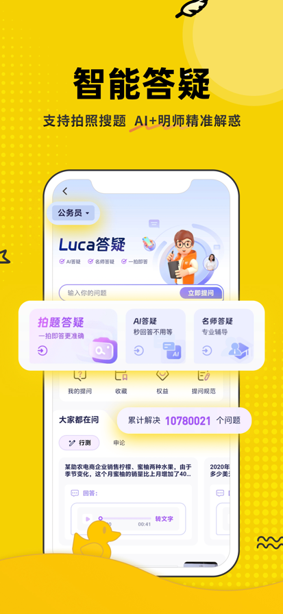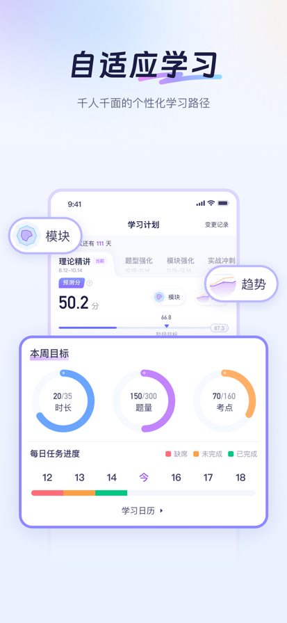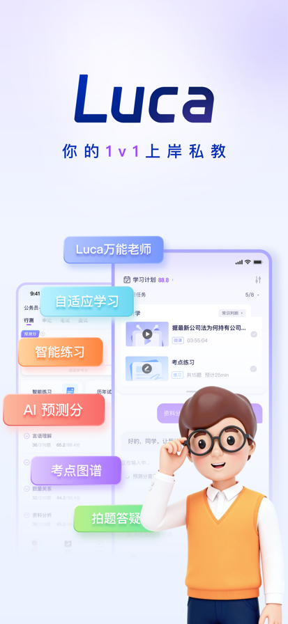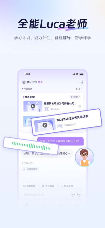 【AI私教】比真人老师还厉害的AI老师,帮你定制备考计划、实时评估、答疑辅导、督学伴学无所不能 【自适应学习】千人千面的个性化学习路径,超越你能想到的更科学、更灵活、更动态、更适合你的的学习方式 【智能练习】查漏补缺精准刷题,预测分模型+个性推题模型,以更少的刷题量拿到更多的分数 【AI预测分】基于千万做题数据训练模型,比模考更精准的诊断,提分的关键是查漏补缺 【考点图谱】学科考点全解构,视频、资料、问答、题目海量资源 【拍题答疑】搜题更准,讲题更透 【申论批改】精准评分,逐句诊断