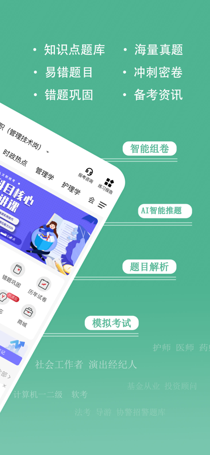 练题狗官方手机学习应用,各类考试备考刷题助手! 高品质课程+海量题库+AI助教,三位一体备战考试~ AI助学焕新上线,章节刷题结合各类考试大纲,AI智能推题精准定位薄弱环节,结合艾宾浩斯遗忘曲线研发"21天抗遗忘训练",让知识点过目不忘,集AI智适应学习、错题巩固、模拟测验和实时考讯于一身,涵盖该考试热点、难点和常考点,覆盖了建工、财经、医卫、外语、职业资格、计算机、金融、公务员培训等备考题库,每个考试科目独立,包含知识点题库、模拟试卷、详细解析、备考指南等内容,是您学习备考的好帮手,题库在手,练练不忘! 【产品功能】 >>练习: 【题库练习】每个科目独立章节题库,按考试大纲分模块突破,实时更新,双轨并进。 【模拟试卷】更有模拟试卷测验,随时检验自己的学习情况。 【AI解析拓展】每个题目新增AI解析拓展,帮助您全面了解知识点。 【AI智能推题】个性化推送薄弱知识点+顽固错题+抗遗忘特训题。 【易错题目】大数据分析各类考试易错题目,针对性的进行练习。 【错题巩固】好用的错题巩固功能,清除您备考路上的顽固障碍。 【我的笔记】好记性不如烂笔头,遇到不会的记录下来随时翻看。 【学习资讯】备考技巧、复习技巧,尽在练题狗。 【技术支持】鼎维云课堂 【联系我们】 微博:@练题狗 微信:liantigouapp 客服电话:+8618290463382 (工作日9:00-18:00)