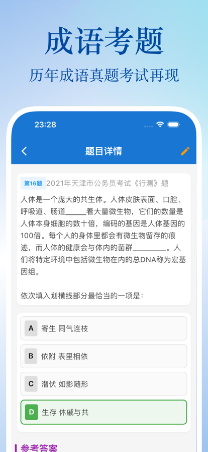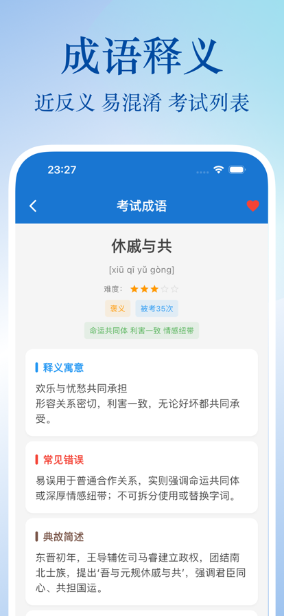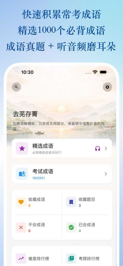 行测成语集是一款专为公务员行测考试打造的成语学习工具,帮助你轻松理解并掌握考试中高频出现的成语及其考点。 主要功能: 1. 2000+考试成语,1000个精选成语支持听音频磨耳朵。 2. 成语排行榜 按难度排行、按考频排行 3. 成语详情全面呈现 展示成语释义、感情色彩、寓意关键词、出处典故、示例句、近反义词、易混淆成语、历年考题出现次数以及对应真题列表,让你对每个成语一目了然。 4. 真题情景再现 还原历年考试中成语出现的真实语境,结合详细的解析,帮助你深度理解考点,高效提升解题能力。 5. 成语收藏夹 收藏你想重点记忆的成语,随时随地打开学习,巩固更方便。 6. 已会 / 不会智能记录 自动追踪你的学习进度,让你的每一次积累都看得见。 7. 快速搜索成语 直接搜索你想学习的成语,高效查找,随查随学。 8. 深色模式支持 减轻视觉疲劳,长时间学习也能更舒适。 9. 同时适配手机和平板 无论在哪种设备上,均能享受清晰顺畅的学习体验。 我们非常期待你的体验和反馈!如果你有任何意见或建议,欢迎通过 App 内意见反馈或直接在评论区留言。 祝你早日上岸!