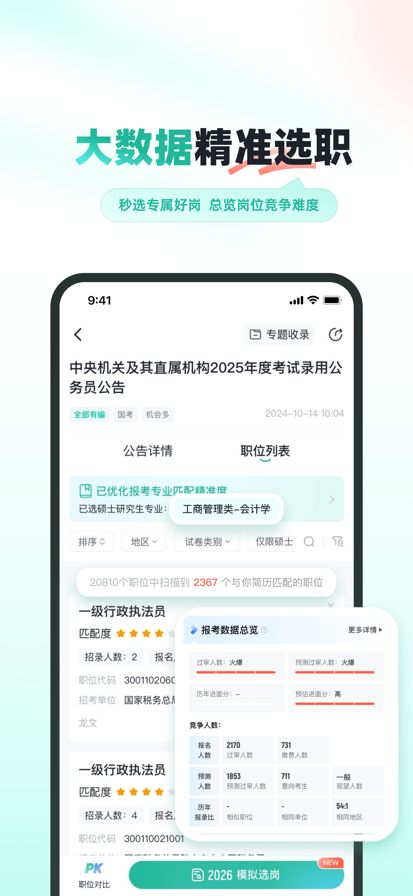 【选职备考,用公考雷达】 千万级用户在使用的公职类选岗APP:提供各地公职类招考资讯、职位智能匹配服务。从公告发布前到录用,全流程服务。 1.考试类型多元 【及时全面】更新各省市区县招考公告。覆盖公务员、事业单位、教师、国企、医疗、银行、军队文职、三支一扶等14大考试类型。 2.大数据辅助选职 【高效选职】输入简历信息,一键匹配各地适配岗位。还可参考历年招录数据,结合职位热度、报名数据预测等大数据科学辅助选职。 3.全周期工具,覆盖考试全流程 【全流程陪伴】包含报考日历、报名大数据、模考、考点查询、考后估分等工具,并提供公告发布、报名、准考证打印、成绩查询等重要节点提醒。 4、本土机构课程推荐 【解决选课难题】严选机构、就近推荐、透明信息,多机构多课程一站式对比,帮你把选课难变成“简单题”。 5.考友社区,互帮互助 【互动交流】汇聚万千考友,报考问题交流、职位前景讨论、上岸经验分享、考试资讯共享等,让备考之路不再孤单。 官方网站:https://www.gongkaoleida.com/ 官方微信公众号:公考雷达 官方小红书:公考雷达 客服电话:13787016502