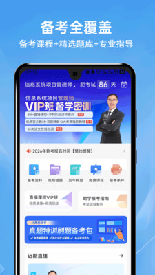 2026年软考上半年考试时间预计安排在5月下旬,下半年考试时间安排在10月下旬。 希赛软考助手一站式解决软考刷题、听课、资讯、备考资料下载多种需求,快速学习备考,节省备考时间。 软考辅导科目: 高级:系统分析师、信息系统项目管理师、网络规划设计师、系统架构设计师、系统规划与管理师 中级:系统集成项目管理工程师、软件设计师、网络工程师、信息系统监理师、信息系统管理工程师、电子商务设计师、软件评测师、信息安全工程师、数据库系统工程师、嵌入式系统设计师、多媒体应用设计师 初级:程序员、网络管理员、信息处理技术员、信息系统运行管理员 主要功能: 【软考考试动态】 不管是考试报名、考试时间、打印准考证、成绩查询、证书领取等考试资讯。 【软考智能题库】 希赛智能AI题库,为考生推荐每日一练、历年真题、模拟试题、高频考点、知识点练习等海量试题,根据学员学习情况,实时对学习成效给出客观的总结分析。学练结合,稳步提升 【软考视频课程】 软考各科目的超清精品视频课程,支持免费试听,语速调节,离线下载等丰富的自助学习功能,利用碎片化的时间、智能便捷随时随地学 【软考在线课堂】 希赛在线课程,实时上课,实时沟通,实时解答,还有实时免费公开课。录播反复学习和理解,为您提供更丰富的教学体验 【软考自学学习包】 软考考点精讲视频+全套备考资料、题库+讲师为您推荐自学复习计划;自学必备产品。