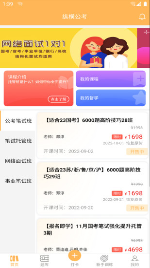 直播课 纵横公考推出笔试、面试的直播课。借助网络直播平台, 通过更加优惠的价格,精致的服务,和考生已录上岸。 题库 纵横公考题库。本着保证足够量的原则, 精选题目,配上逻辑清晰且精益求精的解析。让考生的每道题目绝不白做! 打卡 纵横公考打卡,申论和面试的积累储备,坚持是一种持之以恒的生活方式。但看似简单的事情,实现起来确很难。纵横打卡,通过每天跟随老师打卡的方式帮助你养成良好的学习习惯和时间规划。 新手训练 纵横公考新手训练营。适合公考笔试零基础的同学。训练营覆盖了公考笔试全部入门考点,包含1000分钟行测+申论新手,游戏化闯关入门公考笔试。 官方网址:www.zonghenggongkao.cn 官方微博:纵横公考 微信公众平台:纵横公考 纵横公考是一个大型公考励志公益平台,由邓淳博士创立。本着“用心,让每个学员上岸”的追求,纵横公考不断追踪考生的公考学习路径,提供一站式的贴心服务,努力让每个学员上岸。
