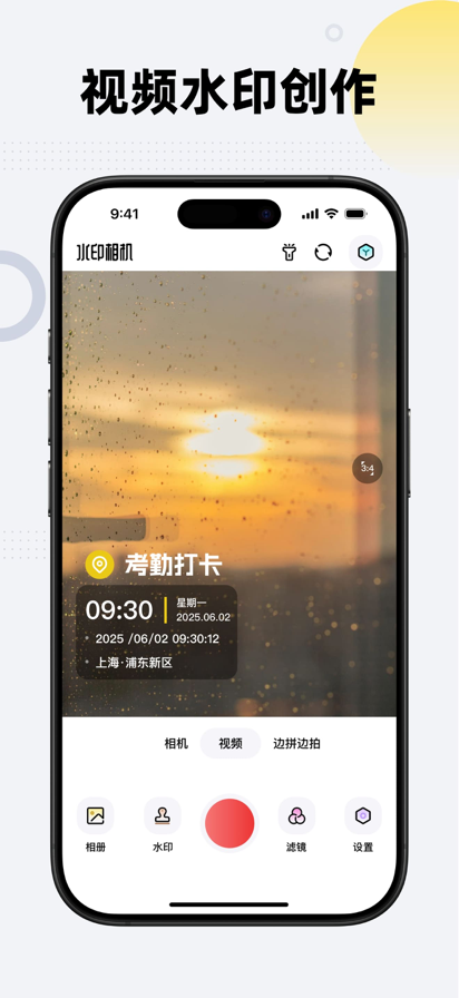 照片和视频一键添加水印。 【适用场景】 工作进度记录、考勤打卡、工程管理、外勤拍照、品牌宣传、现场取证、会议记录、执勤巡逻、记录生活等 【丰富的水印类型】 品牌图、时间、地点、天气、经度、纬度、海拔、编号、速度、分贝、个人名片等 【专业的水印模板】 * 考勤打卡:真实时间和工作地点 * 工作记录拍照:物业管理、工程管理、执勤记录、品牌宣传、会议记录等工作记录专属模板 * 实时更新:水印可自动更新实时的日期、地点、天气等信息 * 自定义水印内容:可自由开关和编辑水印内容选项 【自动续费会员说明】 订阅周期:周订阅、月订阅、季度订阅、年订阅。 -- 订阅价格:以App内信息为准,例如周订阅价格为每周29元,月订阅价格为每月58元,季度订阅价格为每6个月69元,年订阅价格为每12个月99.9元。 -- 付款:用户确认购买并付款后记入iTunes账户。 -- 取消续订:如需取消续订,请在当前订阅周期到期前24小时以前,手动在iTunes/Apple ID设置管理中关闭自动续订功能。 -- 续订:苹果iTunes账户会在到期前24小时内扣费,扣费成功后订阅周期顺延一个订阅周期。 -- 隐私政策:https://yd.mofangzhice.com/policy/rysyxjios/cn -- 用户协议:https://xy.mofangzhice.com/agreement/rysyxjios/cn/ -- 自动续费会员服务协议: https://ff.mofangzhice.com/vipinfo/rysyxjios/cn/