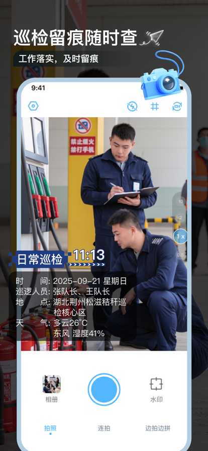 √ 工作生活照片加水印 √ 2013年中国互联网年度“极佳用户体验”产品,千万用户的共同选择 【适用场景】 工作质量记录、考勤打卡、物业工作记录、建筑工程管理、外勤拍照、品牌宣传、现场取证、会议记录、执勤巡逻、旅行打卡等 【丰富的水印类型】 工作、时间、地点、经纬度、海拔、天气、心情、日记、特色等 【专业水印模板】 * 考勤打卡:真实时间地点无法篡改 * 工作记录拍照:物业管理、建筑工程管理、执勤记录、品牌宣传、会议记录等工作记录专属模板 * 实时更新:水印可自动更新为实时的日期、地点、天气等信息,经纬度、海拔、速度也能记录 * 自定义水印内容:可自由开关和编辑水印内容选项,设置自己的纪念日、编辑心情文字等 【一键分享】 朋友圈、微信好友、QQ空间、QQ好友、微博等各大社交平台,均可轻松一键分享,提升工作效率