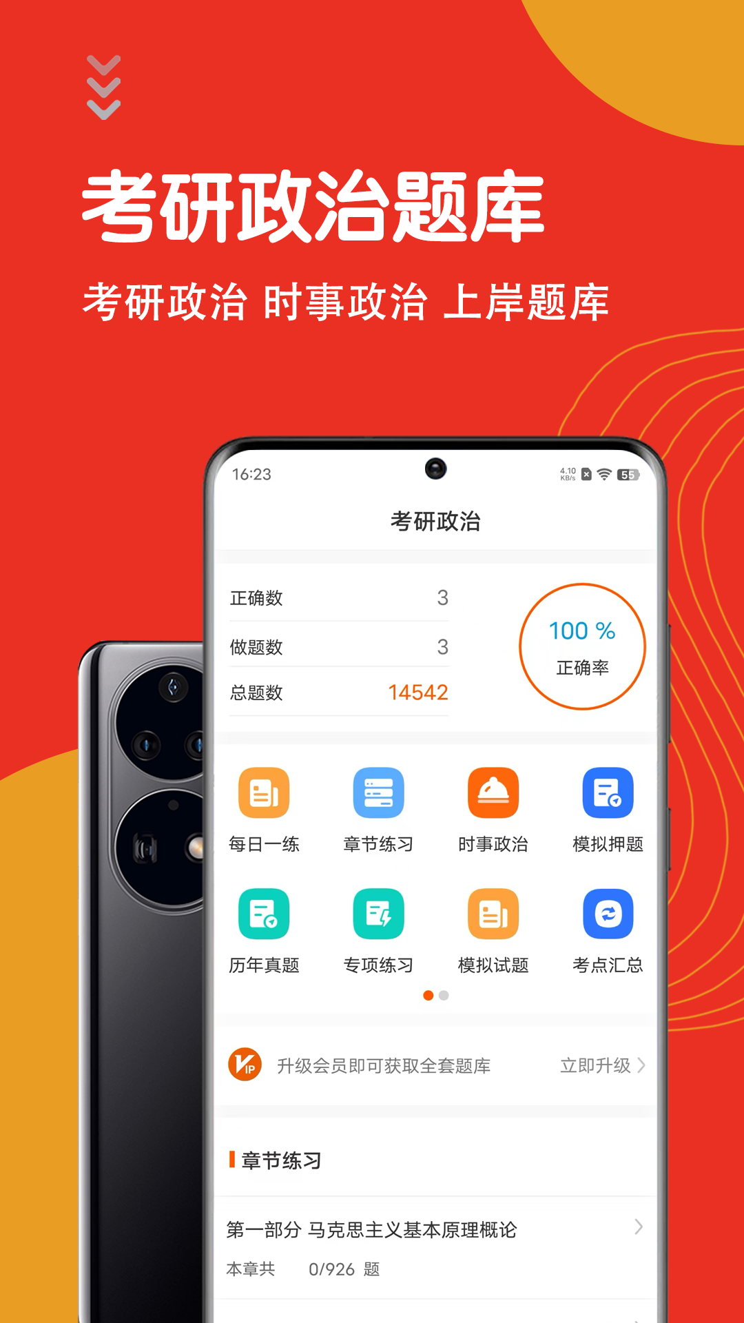 本软件是全国硕士研究生入学统一考试思想政治理论考试题库软件。为考试的提供了充分的复习准备,可随时随地学习练习,有效帮助顺利通过考试,学习知识通过考试必备神器!<br><br>考研政治百分题库考研必备,含近10年考研政治真题,试题附解析,助你考研顺利过关。<br><br>考研政治包括了考研政治、时事政治,思想政治,历年真题,专项模拟训练,备考专业指南,热点时政信息等考研题集,是您冲刺考研、顺利上岸的必备神器!<br><br>考研政治APP是一款专为中国考研用户,提供历年考研政治、考研英语、考研数学等科目的真题及解析和学习资料的平台。平台拥有强大的师资力量和先进的服务团队,为用户提供及时的、权威的、全面的学习参考资料。<br><br>为您提供高质量的考研历年真题,考研刷题,考研复习。汇聚了大量真题、好题,在刷题的过程中巩固知识点,为您考研助力。<br><br>持续更新的国内外时政热点新闻等等内容,为考试的考生提供了充分的复习资料,可随时随地学习练习的移动考研题库,有效帮助您顺利通过考试的必备神器。<br><br>【专项练习】近代史纲要,思想道德修养与法律基础,形势与政策,马克思主义基本原理,毛泽东思想和中国特色社会主义理论体系专项练习;<br><br>【政治备考】<br>考研政治为大家整理了详细的备考信息,包括《政治大纲》《复习指导》《模拟试题》《历年真题》《马克思主义基本原理》《毛泽东思想和中国特色社会主义理论体系概论》《中国近现代史纲要》《思想道德修养与法律基础》《形势与政策以及当代世界经济与政治》等备考模块,在帮助大家找到复习考研政治的同时,为大家积极及时的找到考试大纲,备考等必要必备的信息,同时,备考模块也在不断的完善更新中,做到全网更及时,更有效的考研备考信息。<br><br>【模拟押题】重点、考点、难点,一网打尽;<br><br>【历年真题】过往历年真题,随时随地练习,查漏补缺;<br><br>【考点汇总】核心考点详细整理,查漏补缺,迅速提分;<br><br>【错题库】错题自动收录,好题手动收藏,查漏补缺;<br><br>章节目录:<br>马克思主义基本理论部分<br>01.第一章 马克思主义是关于无产阶级和人类解放的科学<br>02.第二章 物质世界和实践<br>03.第三章 认识的本质及其发展规律<br>04.第四章 社会基本矛盾<br>05.第五章 资本主义的本质及规律<br>06.第六章 资本主义发展的历史进程<br>07.第七章 社会主义社会及其发展<br>08.第八章 共产主义是人类崇高的社会理想