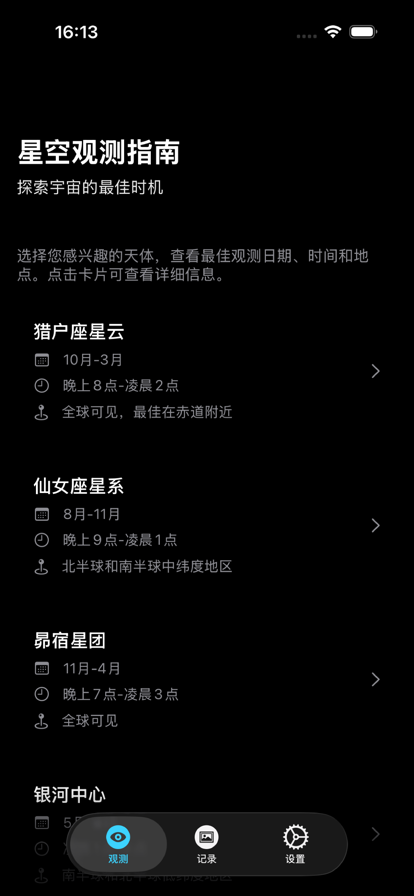 这是一个为星空拍摄爱好者开发的app,用户可以查看星空最佳拍摄点与拍摄时间。 记录自己的最佳拍摄作品,快去分享你的星空下的独特作品,与更多星空爱好者交流学习。