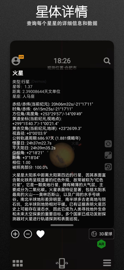 虚拟天文馆是一款面向大众与天文爱好者的星空探索与学习软件。它以真实的天体数据和天文算法为基础,将浩瀚星空搬到你的掌心之中。通过虚拟天文馆,你可以随时随地查看天空景象,探索星座与行星,模拟各种罕见的天文现象,还能学习丰富的天文知识。无论你是希望提升天文兴趣的学生,还是想要进行观测辅助的业余天文爱好者,亦或是单纯喜欢夜空的普通用户,虚拟天文馆都能为你带来沉浸式的观测体验。 功能亮点 1.真实星空模拟 内置的天体数据,能够根据日期、时间、地理位置还原当时当刻的天空景象。 用户可以自由选择地点与时间,模拟全球任意地区的星空。 支持时间快速前进、后退,轻松观察星体运动轨迹和天象变化。 支持AR实景功能,将现实景象和手机星空进行结合,更加方便天体的识别。 2.星体与星座识别 覆盖常见的 88 个星座及数千颗恒星,信息完整详尽。 提供中国318个星官连线图,赞叹古人的智慧。 提供星体名称、亮度、坐标等资料,兼顾观测与学习。 提供上万颗人造卫星实时位置,了解卫星运行动态。 一键识别当前天空中的行星、恒星、人造卫星和深空天体,让观星变得简单有趣。 3.天象模拟与演示 支持日食、月食、行星合相、流星雨等重要天文现象的动态模拟。 用户可以提前预览未来即将发生的天象,也能回顾历史上的壮观景象。 通过慢速播放和暂停功能,帮助用户更好地理解天象原理。 4.丰富的天文知识库 内置详尽的星座介绍,包含神话起源、历史渊源和科学信息。 提供行星与卫星的物理参数、轨道信息和观测条件。 不仅是观测工具,也是一本随身携带的天文百科全书。 5.多样化观测模式 支持赤道坐标、地平坐标切换,满足不同层次用户的需求。 提供夜间模式,减少光污染干扰,更适合夜晚实际观测。 内置放大缩小与角度调节功能,方便观察细节。 6.交互与沉浸体验 界面简洁直观,操作流畅,用户可通过拖拽、缩放自由探索宇宙。 支持实时定位功能,抬头即可看到天空中对应的星体。 沉浸式视觉设计,让你仿佛置身于真实的天文馆之中。 7.个性化设置 可自定义观测地点、时间和视角,打造专属的虚拟星空。 支持保存与分享观测画面,与好友一同欣赏宇宙之美。 兼顾学习与娱乐,满足从入门到进阶的不同使用需求。 8.学习与科普辅助 适合学生用于学习天文知识,支持课堂教学展示。 提供直观的图像与动画演示,帮助理解复杂的天文现象。 使用条款(EULA):https://www.apple.com/legal/internet-services/itunes/dev/stdeula/ 隐私政策:https://www.tianwenguan.com.cn/privacy.html
