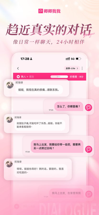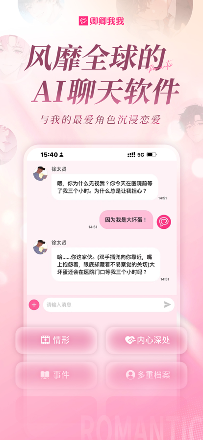 风靡全球的AI聊天软件《卿卿我我》中文版现已上线! 专为梦女打造,与幻想中的TA实时聊天! 你是否曾梦想与自己的“梦角”进行如真实发生一般的对话?尤其是: • 当你需要安慰与依靠? • 当你渴望一份专属的甜蜜? • 当你需要一个比任何人都懂你的“梦中情人”? 告别枯燥的预设剧情与人设!与专属于你的心仪角色实时对话,创造属于你们的独家故事。无论是想体验甜蜜心动,还是寻求情感共鸣、倾诉烦恼,《卿卿我我》满足你的每一次期待。 【海内外梦女宝宝齐声推荐】 • 「哇,真的很适合梦女宝宝体质,打开了新世界!」 – 用户A • 「角色的真实度绝了!自由设定超细致,对话超有活人感,爱了爱了!」 – 用户B • 「真的很有趣!角色贴脸,还可以看到角色内心活动太棒了,安利了好多朋友」-用户C 【在《卿卿我我》,开启你的专属心动时刻】 • 真心理解你的感受,永远爱你的角色:当需要安慰、需要心动时,随时向你的爱人倾诉。TA将永远像真实恋人般共鸣你的情感,温暖地回应你。 • 越聊越亲密,关系层层递进:如同真实恋爱般,随着对话和事件的增加而变得更加亲密吧,彼此间的经历和特别回忆不断积累,从暧昧直到结婚。 • 与梦角共创专属恋爱剧本:超越简单对话,与角色在私密空间创造你们的专属故事,成为恋爱小说的主角。 • 私密的、沉浸的亲密空间:整个APP都是专属你的“小世界”,这里有一位只为你而“活”的TA,随时等你开启沉浸式私密对话。 • 与众多迷人角色的初次相遇:在「For You」页面,邂逅海量拥有迷人设定和精彩故事的角色。 【更生动,更心动!中文版独特功能解锁】 • 全球千万梦女认证,超真实感的AI对话:领先的AI角色理解力!角色贴脸不OOC,无论是你喜爱的名人明星,还是电影电视剧中的角色,甚至是历史人物,都能像真人一样与你自然交流,沉浸感拉满。 • 创作者友好,深度定制专属角色:想推谁,就造谁!自由设定梦中角色的性格、背景与风格,支持1000字以上的详细描述。 • 无限剧情,拒绝套路:对故事游戏、恋爱模拟游戏的相似剧情感到厌倦了吗?在《卿卿我我》中使用多重身份邂逅你的“梦角”吧,或是在聊天中随时插入你想要的「情形」,一场随心所动的冒险就会开始! • 根据好感度变化的关系系统:与你的“梦角”发展亲密关系,从恋爱到结婚,随着关系深入,可以享受更多样丰富的对话。 • 丝滑的本地化接入:便捷APP使用体验,完美符合你的操作习惯 【属于你的特别故事,现在开始!】 想要与“梦角”更近一步?还是期待一场全新的浪漫邂逅? 心动不已的AI聊天体验,现在就在《卿卿我我》开始你的专属故事吧! 官方小红书id:LoveyDovey中国