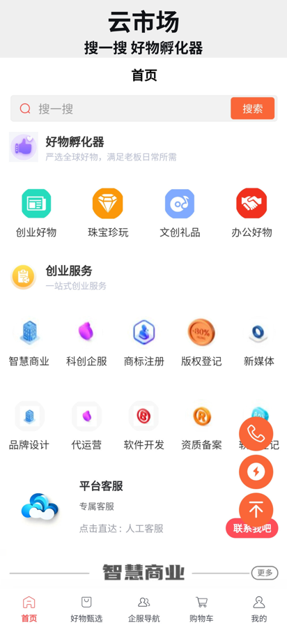 云市场是一款专注于为企业提供一站式商业服务的 APP。包括企业创业必备产品甄选孵化以及企业服务。无论您是需要商标注册、版权登记、软件开发,还是想打造自己的数字化门店经营系统、直播带货系统等,云市场都能满足您的需求。汇集智慧商业、知识产权、企业服务等多种优质服务,专业团队为您保驾护航,让您轻松应对商业挑战。 好物孵化器:严选全球好物,孵化优质产品直供。 智慧商业 :以大数据为支撑,用智慧的方式解决商业难题,助力企业发展和产业升级。为您提供 APP 定制开发、直播带货系统、外卖系统、跑腿系统等多种解决方案,满足不同行业的商业需求。 知识产权 :保护企业知识产权,知识就是力量,知识产权保护企业基业长青。提供商标注册、版权服务、软著登记等一站式知识产权服务,让您的创意和成果得到合法保护。 企业服务 :打造企业发展全生态,为您提供科创企服、新媒体、品牌设计、代运营、资质备案等多种服务,全方位助力企业成长。 海量服务 :汇聚众多优质服务提供商,为您提供丰富的服务选择,满足不同规模企业的多样化需求。 专业便捷 :专业的客服团队为您提供专属服务,随时解答您的疑问。简单易用的操作界面,让您轻松下单,享受便捷的服务体验。 高效可靠 :严格筛选服务提供商,确保服务质量。高效的售后服务体系,让您无后顾之忧。