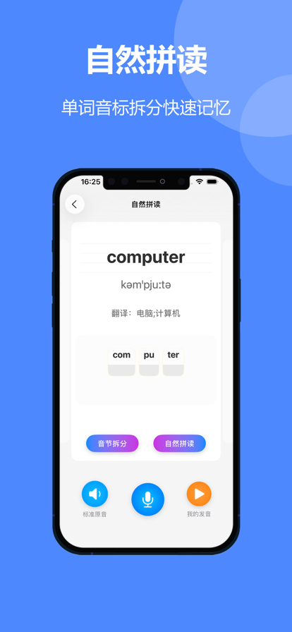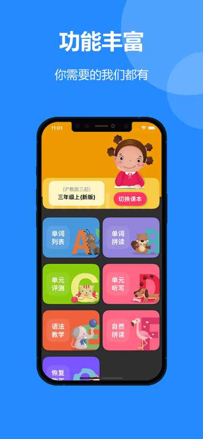 主要功能 -英语课本点读 只需轻轻一点,纯正发音即刻响起。无论是单词、句子还是对话,都能随时听、随时学。跟读模仿,提升口语;反复练习,巩固记忆。 -英语单词跟读 根据同步英语课文单词助于学习者更好地掌握英语单词的发音和语调。 -英语同步学课文 帮助学生通过跟随课文音频或视频,同步朗读和理解课文内容,从而提高英语口语、听力、阅读和写作等多方面的能力。 -单词磨耳朵 通过反复聆听英语单词或短语,学习者可以逐渐熟悉英语的语音、语调和发音特点,从而提高英语听力理解能力。 -课文单元听写 朗读课文中的单词、短语、句子或段落,学生则凭记忆将这些内容笔录下来。训练学生的听力、记忆力和书写能力。 -英语消消乐 “消除游戏”的乐趣与英语学习的元素。通过游戏提高英语单词记忆、语法理解能力。 -英语发音测评报告 通过测评,学习者可以更加清晰地认识到自己在语调、音准、连读、节奏以及音节与重音等方面的表现,从而有针对性地提升英语发音的准确性和流利度。 IOS也可以更新这个版本