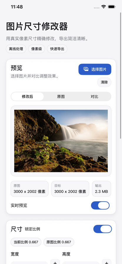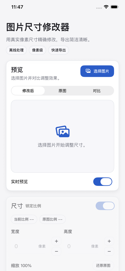 「照片大小」是一款关于调整照片大小、尺寸、比例的神器,它包括但不限于以下功能: • 放大降噪:一键增强照片,黑科技让模糊的照片变清晰~ • 缩小压缩:无损压缩,在缩小的同时,最大限度保证照片质量。轻松满足各种证件上传要求~ • 旋转裁剪:按比例裁剪出心仪的照片~ • 相册清理:按照文件大小对相册进行排序,找出大文件,批量快速删除~ ...... 还在苦恼照片模糊? 还在苦恼照片达不到上传要求? 还在苦恼存储空间不足,照片太多没办法筛选? 试试「照片大小」吧,简单,免费,极大提高你的效率。 「照片大小」才刚刚起步,功能还待完善,有任何问题或者建议,欢迎联系我们。 联系方式:hitwhylz@163.com