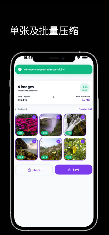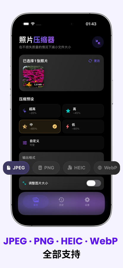 自研压缩算法,有效缩小图片体积,保留高清品质,节省空间,支持相册压缩、多选压缩! 核心功能: - 可自定义压缩质量 - 可自定义图片裁剪尺寸 - 文件处理后一键删除原图 - 可清理相册中的相似图片 如果对本产品有疑问或者建议,烦请通过dydesign_dev@163.com联系我们。 隐私政策:https://distinct-xenon-e6f.notion.site/70a9fed28a5543b4a51d552ea8035495 付费协议:https://distinct-xenon-e6f.notion.site/dd7ec43bbd054526a1a43a2ae383dad8 使用条款:https://distinct-xenon-e6f.notion.site/58659ef8b0574a82920a1dc6a216c95b 技术支持:https://distinct-xenon-e6f.notion.site/3f5699c4f43349bbb07e685f5bf6d5be