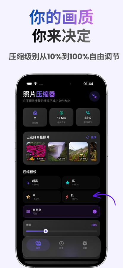 快速压缩图片大小,以节省存储空间,支持批量压缩! 功能简介: - 支持单张压缩和多张批量压缩 - 自定义图片压缩质量 - 自定义图片缩小尺寸 - 一键批量压缩图片 Fast compress picture size to save storage space, support batch compression! Features: - Supports single sheet compression and multiple sheet batch compression - Custom image compression quality - Custom picture reduction size - One-click batch compression of pictures