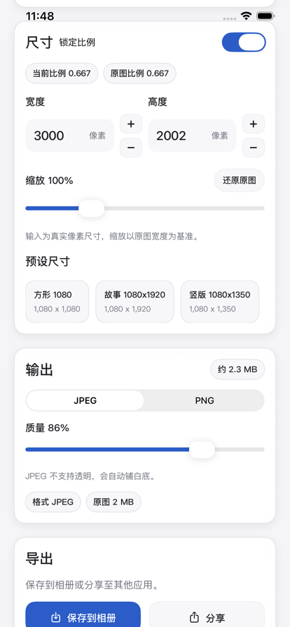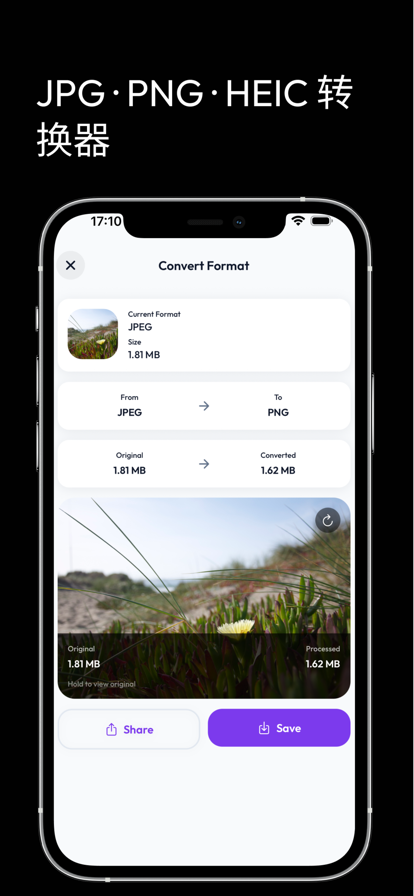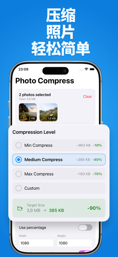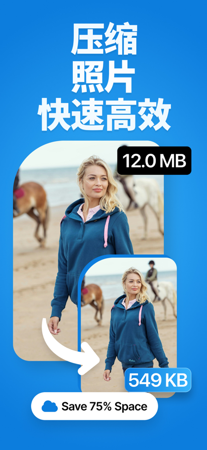 轻松缩小图片、压缩照片,节省 iOS(iPhone/iPad)存储空间。现在免费下载! 适用于: - iPhone/iPad 存储空间快满时,快速释放空间 - 批量压缩照片,减小文件大小,分享/发送更快(微信/短信等) - 将 HEIC/HEIF 转换为 JPEG,兼容性更好 概述: - 压缩单张照片、多张照片或整个相册(批量压缩) - 自定义 JPG/JPEG 压缩强度 - 自定义缩小图片尺寸(可选) - 无需调整尺寸也可压缩 - 预览查看图片质量 - 显示压缩前后照片占用的存储空间 - 简单易用,直观上手 - 支持将 HEIC/HEIF 照片转换为 JPEG - 可选:自动删除原始照片,仅保留压缩后的版本。请注意:已删除的照片仍可能出现在“最近删除”相册中。要真正节省存储空间,也请在“最近删除”中一并删除。 Standard Apple Terms of Use (EULA): https://www.apple.com/legal/internet-services/itunes/dev/stdeula/