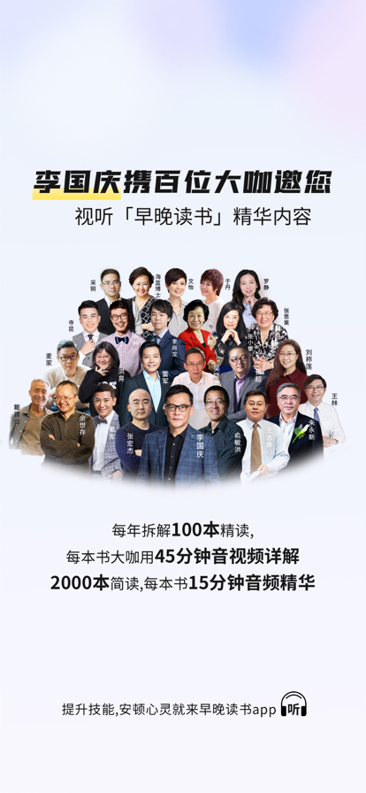 早晚读书由当当网创始人李国庆创办。早晚读书秉承私塾传统,以音视频的形式向用户传递书香,让三、四、五线城市的用户获得同等优质教育资源,并借助互联网技术将线上与线下打通,开办线上读书沙龙,名家名师在线与读者互动。 【大咖讲书】 读不懂怎么办?百位大咖为你精选精解必读经典好书,每年100本精讲(每本书45分钟音视频详解)+1000本简讲(每本书15分钟概要)作为延申拓展书目,助你快速把握和吸收书中精粹。VIP年卡会员可免费视听以上全部讲书内容。 【线上共读营】 读书坚持不下去怎么办?请导师促读,同学共读。共读营是由领读人、嘉宾、读友共同参与的读书社群,领读人导师提供详细的读书计划,并邀请嘉宾定期在社群内举办视频直播共读活动、答疑解惑,学员分组讨论,分享读书心得。VIP年卡会员可免费参加12场线上共读营。 【有声书:180小时耳朵旅行计划】 不知道该读哪些书?为你量身定制180小时耳朵旅行计划。早晚读书每年新增不少于10000种优质有声书,VIP年卡用户可全年跨品类收听早晚读书app内有声书达180小时。 【直播大课】 怎么运用到实践中去?创业教父李国庆亲授创业/职场线上直播大课,手把手教你创业指南、管理真经、职场攻略;经管书院VIP会员可免费获得2次李国庆线上大课门票; 【精品课程】 早晚读书VIP会员可免费专享400小时各类精品课程,其他付费课程,会员可享有5折起优惠价。 【内容分类】: 早晚读书经管书院: 经营人心,管理人性。45分钟听完一本书:《商业模式全史》《麦肯锡工作法》《影响力》《原则》《优势谈判》《销售圣经》,为卓越组织与未来领袖赋能。 早晚读书自我成长书院: 高效成长,追求卓越。45分钟视听一本书:《人性的弱点》《习惯的力量》《学习之道》《所谓情商高,就是会说话》《被讨厌的勇气》,让弱点变成强点,让软肋变成盔甲。 早晚读书父母书院: 聪明养育,赢在未来。45分钟视听一本书:《养育男孩》、《养育女孩》、《回应:培养孩子积极的行为习惯》、《如何说孩子才会听,怎么听孩子才肯说》、《如何培养孩子的社会能力》。让爸爸更有力量,让妈妈更有爱。 早晚读书亲子共读书院 亲子共读,滋润心智。45分钟视听一本书:《中国神话故事》、《新时代新创造儿童绘本故事》、《英文三字经(自然拼读)》。和孩子一起读书是最好的家庭教育 早晚读书通识书院 无用之用,方为大用。45分钟视听一本书:《罪与罚》《世说新语》《传习录》《万历十五年》《流血的仕途》,分享人类最顶级的思想和智慧。 种一棵树,最好的时间是十年前,其次是现在。 现在下载早晚读书,新用户7天会期免费领。