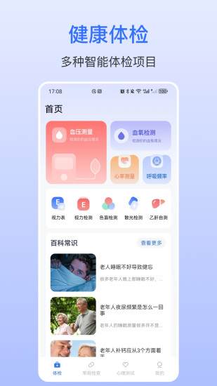 这是一款可以在手机进行血压、血氧测试的血压测量仪,更加的方便。操作简单,只需将手指按住摄像头,就能轻松测出数值,保留测量结果,方便观察身体情况。超多实用测量,及时了解自己的身体情况。 【特色功能】 1.随身测量:随时可进行血压、心率、血氧测量,准确率高,方便用户进行日常检测 2.特色检测:用手机进行视力检测、色盲检测、散光检测 3.超多测试:超多热门测试可选,来看看有没有你感兴趣的 4.体检数据库:包含血糖仪、血红蛋白、心脏健康、肝功能、便常规、尿常规等超多常规检测数据库,帮你分析和了解你的体检测量数值 【适用人群】 - 中老年人 - 身体指数出现异常,需要经常监测身体数值的人群,该软件为你提供一个更加方便、功能更全面的渠道 - 康复期 - 康复期人群需要进行长期的身体数据监控,方便进行康复 【注意事项】 *手机测量数值与仪器的精准测量数值存在较小偏差,介意者慎用