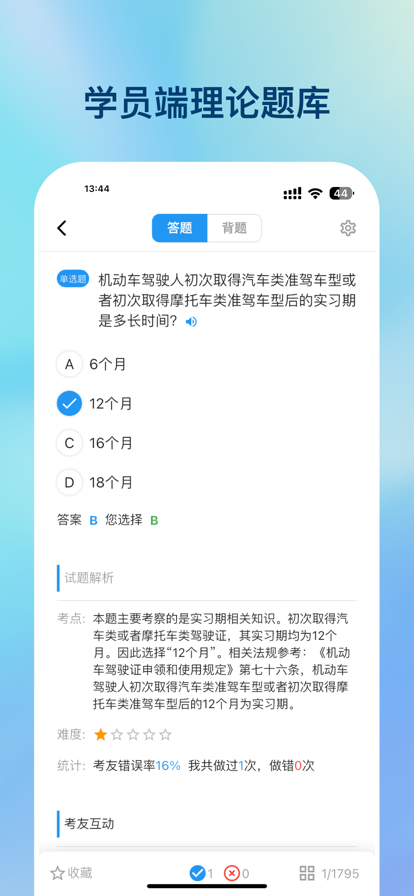 是一款专为考驾照学员设计使用的app,以理论和实践相结为出发点,努力提高学员驾车技能为目标,助力更快捷拿到驾照的一款手机软件.app中包含科二,科三视频教学,科一,科四理论仿真模拟习题,练车扫码便捷登录入口,随时随地轻松预约教练等功能.祝您轻松愉快,快速拿到驾照.