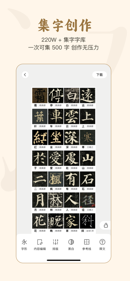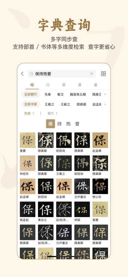 六品堂旗下掌上碑帖团队出品,是一个专业的书法单字视频学习平台,为用户提供专业的书法内容及服务。它更是一款好用的书法工具,开发了一系列实用功能例如:书法字典、集字、碑帖等,并对常用碑帖录制了逐字示范视频,帮助初学者入门和进阶。 【视频示范】 邀请了书法界诸多前辈为掌上碑帖录制示范视频,对常用碑帖录制了逐字示范视频,帮助书法爱好者入门和进阶,碑帖包含:《多宝塔碑》、《曹全碑》、《雁塔圣教序》、《秾芳诗帖》、《三坟记》、《夏日诗帖》、《智永真书千字文》、《阴符经》、《九成宫》、《胆巴碑》、《乙瑛碑》、《前后赤壁赋》、《黄州寒食帖》、《始平公造像记》、《玄秘塔碑》、《张迁碑》等单字示范,并且不断在更新... 【书法字典】 五种书体——楷、行、草、隶、篆50w+字库,覆盖常用字及字体,免费使用。 【集字创作】 200字长文本输入,一键统一书家书体风格,免费使用。还有集字春联、集福字、扇面、条幅、印章等创作内容以供参考。 【超清碑帖】 数千本碑帖免费浏览,还有很多的临帖实用小功能,帮助用户更好的去临摹。碑帖涵盖:王羲之:兰亭序、怀仁集王圣教序、初月帖、得示二谢帖、快雪时晴帖、丧乱帖、姨母帖、奉橘帖、频有哀祸帖、黄庭经、十七帖、乐毅论、何如帖... 王献之:洛神赋十三行碧玉版、鄱阳帖、地黄汤帖淳化阁帖版、鸭头丸帖、鹅群帖、廿九日帖、中秋帖... 颜真卿:颜勤礼碑、东方朔画赞、多宝塔碑、郭虚己墓志、祭侄文稿、刘中使帖、麻姑仙坛记、裴将军诗、争座位帖、自书告身帖、大唐中兴颂、李玄靖碑、唐王琳墓志、湖州帖、颜氏家庙碑、元次山碑... 欧阳询:九成宫醴泉铭、行书千字文、化度寺碑、皇甫君碑、仲尼梦奠帖、心经、张翰帖、虞恭公碑、李誉墓志、卜商帖... 柳公权:神策军碑、玄秘塔碑、金刚经、九疑山赋、兰亭诗、蒙诏帖... 赵孟頫:前后赤壁赋、归去来兮辞、洛神赋、妙严寺记、秋声赋、三门记、胆巴碑、汲黯传... 褚遂良:雁塔圣教序、大字阴符经、倪宽赞、伊阙佛龛碑、善才寺碑... 米芾:蜀素帖、苕溪诗帖、吴江舟中诗卷、箧中帖、研山铭、竹前槐后诗帖、淡墨秋山诗帖、方圆庵记、晓行巴峡、珊瑚帖... 张旭:断千字文、肚痛帖、古诗四帖、郎官石柱记、晚复帖、李青莲序... 怀素:苦笋帖、自叙帖、草书千字文、食鱼帖、圣母帖...等经典名家碑帖... 5大书体覆盖 楷书:多宝塔碑、颜勤礼碑、玄秘塔碑、九成宫醴泉铭、胆巴碑、雁塔圣教序、智永千字文等 行书:兰亭序、祭侄文稿、寒食帖、怀仁集王圣教序、伯远帖、韭花帖等 草书:书谱、自叙帖、古诗四帖、草决百韵歌、草书千字文、十七帖、初月帖等 隶书:乙瑛碑、曹全碑、礼器碑、张迁碑、鲜于璜碑、史晨碑、石门颂、西狭颂、华山碑等 篆书:散氏盘、毛公鼎、虢季子白盘、侯马盟书、石鼓文、琅琊台刻石、泰山刻石等 【书法社区】 探讨交流书法的集合地,让书法学习不再孤寂。 书法 书法字典 书法碑帖 书法临帖 毛笔 书法字帖 字帖 练字 书法碑帖大全 书法字典查询 碑帖 【自动订阅服务说明】 1.订阅服务: a)掌上碑帖VIP连续包月(1个月); 2.订阅价格: a)掌上碑帖VIP:连续包月会员产品为首月6元/月,次月起19元/月; 2.自动续费:苹果iTunes账户会在到期前24小时内扣费,扣费成功后订阅周期顺延一个订阅周期; 3.关闭服务:您可以在苹果手机“设置” --> 进入“iTunes Store 与 App Store”-->点击 “Apple ID”,选择"查看Apple ID",进入"账户设置"页面,点击“订阅”,管理自动订阅服务,如需取消,每个计费周期结束前24小时关闭即可,到期前24小时内则不再扣费。 4.自动续费服务协议: http://zsbt.liupinyike.com/zsbt_rules/autorenew.html 5.会员服务协议:http://zsbt.liupinyike.com/zsbt_rules/vip-serve.html