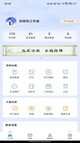 大医云承是中医药传承及互联网医疗服务平台,是把脉互联网医院官方指定合法执医平台,以国医大师、非遗传承人为师资,云端授课与线下面授结合,全国范围启动中医药传承计划!医生可以轻松建立专属医馆,合法执医中医平台,全流程诊疗,获得阳光收益!高效管理问诊患者,患者不流失,打造个人品牌!专业定制问诊单,全方位了解病情,电话或视频问诊沟通,精准辩证。经典方、历史方,一键拍方。饮片、颗粒、丸剂多种药态,按需选择!全国药房供货,顺丰配送。客服热线:4000866520