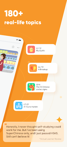 - 19 排名人工智能助力汉语学习,说得更流畅,说得更自信。<br>全方位的学习方法,训练汉语听说能力的超级APP<br>产品特色:<br>全新设计,全面学习<br>SuperChinese 是新一代汉语教学应用,结合了多年对外汉语教学的专家经验、同时利用了AI智能算法。课程内容贴近生活,学习过程互动性强。<br>学习汉语,无需死记硬背,按照计划,让我们帮您把握重点。<br><br>基于AI的专业测试<br>基于独家AI技术,准确评测汉语水平。不仅如此,您还能够定制专属学习体验路径,最终达到流利使用的目标。<br><br>极易上手的课程安排,根据计划,随时随地学习。<br><br>听说评测<br>像中国人一样发音。用正确声调朗读生词、句子,在特定场景中理解语言含义。<br><br>图文并茂的教材<br>创作了一系列动画、图片来展示不同的场景和语义概念,有趣又深刻地帮助用户记住知识点。<br><br>高质量的内容<br>我们每节课的教材内容都经过反复打磨。涵盖50多种话题、400多节课程,陪伴您掌握汉语能力。通过AI的复习计划,您的学习将事半功倍。<br><br>享受SuperChinese +服务,提升中文听说流畅度<br><br>Learn Chinese faster using Artificial Intelligence. Speak Chinese confidently. <br><br>All the Best Language Learning Approaches Integrated Into 1 Super App <br><br>SuperChinese is the top Mandarin Chinese learning APP with AI based multi-sensory input. Speak Mandarin Chinese the way you’ve always wanted to. <br><br>Powered By AI<br>· Spaced Repetition: Remember effortlessly <br>· Animated Videos: Conceptualize Faster<br>· Thematic Lessons: Understand Context <br>· Complete fluency: speak Chinese, read Chinese, write characters and improve your Chinese listening<br>· Gamification: Enjoy learning Chinese <br><br>For basic Chinese learners we cover Pinyin (think of it as the Chinese alphabet!) so you can learn how to speak Chinese and improve your Chinese pronunciation. Beginner Chinese language learners will find it easy to start learning their target language with Super Chinese. It’s simple to learn Chinese characters, Chinese vocabulary and essential Chinese phrases. Super Chinese makes learning Chinese easy. <br><br>Features that make learning Mandarin Chinese simple!<br><br>Expertly crafted for your success<br><br>SuperChinese uses advanced AI technology to meet your personal learning style. Lessons are drawn from a wide range of real-life topics, presented in a way that sticks. <br><br>No need for a language tutor, our Chinese lessons are built to cover all aspects of learning a new language: speak Chinese, read and write Chinese characters, and improve your Chinese listening skills. Are you a beginner? Start with Chinese pinyin. <br><br><br>Don’t worry about remembering, focus on what matters our app will do the rest. Language learning made easy!<br><br>AI based proficiency Test: Your Chinese test<br><br>A unique and precise way to know your exact Chinese level. Customize your learning experience and set yourself on the path to complete Chinese fluency. From basic Chinese to advanced learners of Mandarin Chinese, with our free level test, you’ll always start at the right level. <br><br>Bite-Sized Lessons: Learning Chinese is easy<br><br>Learning built around your busy schedule. Each lesson takes about 10-15 minutes to complete, keep your streak going. It only takes a little time every day to improve your Chinese skill.<br>Speech Recognition: Speak Chinese fluently<br><br>Speak like a native. Pronounce words in the right tone and understand their contextual meaning in daily conversations. Super Chinese offers you a faster way to speak Chinese. Struggling with learning Mandarin pronunciation? Your AI language tutor let’s you know where you need to improve. It doesn’t just work for Chinese vocab, it also works for Chinese phrases! <br><br><br>Animated Thematic Videos: Top Chinese content<br><br>Conceptualize faster with the help of animated videos and visual stories. Create a lasting mental picture. We understand it’s not easy to learn a foreign language, so we’ve created videos with real dialogue that you can use in a Chinese conversation anytime. It’s fun and easy! <br><br>Quality Content: easy Chinese lessons<br><br>Enjoy over 400 Lessons, split into 9 Chinese levels and based on more than 50 interesting themes. Remember effortlessly through AI powered spaced repetition. Learn Chinese systematically, from basic Chinese to advanced Chinese, we have the right content for all Chinese language learners. <br><br>Go All the Way with SuperChinese + <br>Accelerate your path to fluency, speak Mandarin Chinese faster 大小 NaNM 类型 0评分