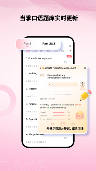 趴趴雅思为雅思考试官方金级合作伙伴,致力于为广大烤鸭提供科学有效的备考素材及提升方法,帮助烤鸭一站分手雅思! 我们将为你提供的亮点功能: 【口语题库+答题素材+素材音频】 当季题库第一时间更新,新题抢先练!所有素材均由雅思前考官审核,真正地道表达~P2部分十种题材可供选择,素材更具针对性! 【写作各题型题目范例+高分范文】 写作老大难?趴趴明星师资每季度梳理当季高频题型,搭配高分范文参考,备考更有方向! 【真人外教口语模考陪练】 口语备考,练习少不了。25mins/次视频通话,专业外教1V1模拟考场问答,还原真实考试体验~便捷预约板块,灵活约课~ 【听说读写全科机经】 高命中率机经收录,听阅均为趴趴汇总收集的近10年来高频考题,口语写作当季重点题型题目定期更新 【雅思公益课】 明星级老师定期免费开放公益课程,雅思必考难点、备考思路免费学! 【雅思训练营】 每期免费开设督促打卡学习~不论你是雅思小白或是冲刺备考,这里总有和你志同道合的的小伙伴一起努力!