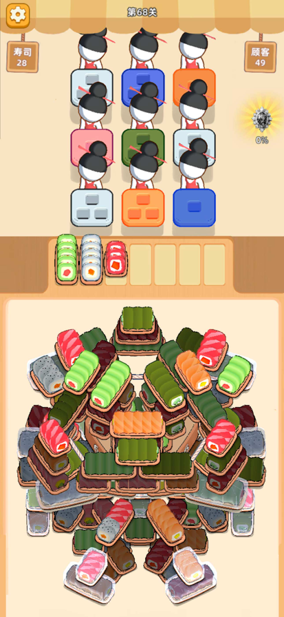 厨房告急!客人们正眼巴巴地等着吃寿司,服务员也开始着急得冒汗了!快用灵巧的手速和精准的判断力,把寿司送到他们的盘子里吧! 点击寿司,将它移动到对应的位置,准备好给服务员上菜!服务员需要的寿司颜色和数量都摆在餐盘上,快速消除他们的需求!每次送对寿司,服务员就会满意地收下餐盘,完成任务。 小贴士: 1.一次上菜的空间有限,要学会合理规划放置,避免位置被填满! 2.优先处理最近的订单,这样可以更快清理掉任务。 3.遇到麻烦?用好道具!“铲除”“移动”都能帮你轻松过关~ 亮点特色: - 趣味满分: 绚丽多彩的寿司造型萌趣十足,给你满满的食欲和好心情! - 脑力大挑战: 既需要眼手配合,又考验你的逻辑规划,休闲中还能动脑。 - 解压轻松: 配合清新明快的背景音乐,将寿司订单解决简直乐在其中! - 内容丰富: 随着关卡升级,更多服务员和道具等你挑战,乐趣层层加码! 厨房的危机能否得救,就看你的了!快用你的妙手和智慧让所有人满意离开,把寿司店的门庭若市进行到底!