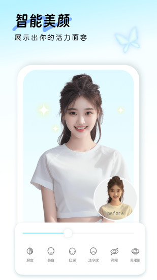 适合你的拍照神器重磅来袭,美颜滤镜功能专属升级,每个人都能找到属于自己的美颜模式。 实时预览美肤程度,为自己预设属于自己的美颜效果,瘦脸、美白、大眼等一键保存。 简单操作,轻松上手,给你完美容颜,尽情拍拍拍~ 1.五官立体:深邃大眼、高挺鼻梁、立体V脸一秒拥有! 2.磨皮美白:让皮肤白皙透亮,打造零毛孔美肌,效果超乎想象! 3.瘦脸瘦身:手指滑一滑,立刻优化脸型,想瘦哪就瘦哪! 4.祛斑祛痘:不做“豆”花妹,手指点一点,斑点、痘痘都退下! 5.美化眼睛:放大眼睛,加亮眼部轮廓,瞬间拥有混血儿般立体双眸! 6.淡化黑眼圈:熊猫眼走开! 熬夜晚睡照样美!