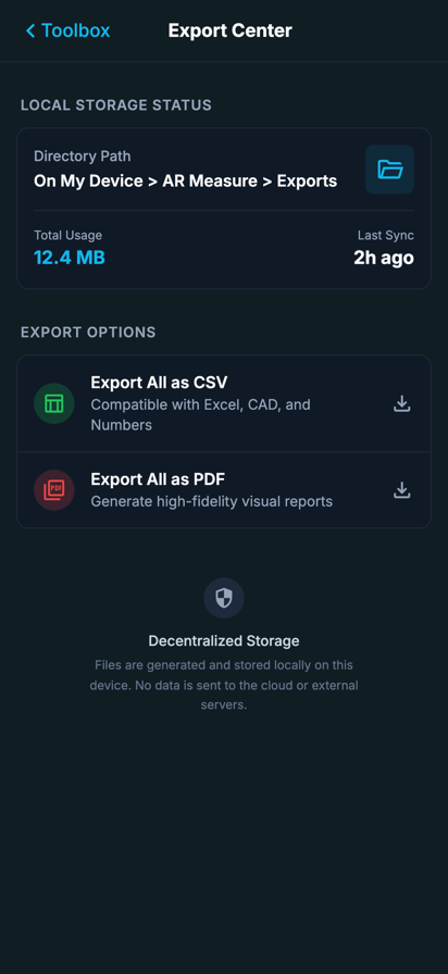 【AR Measure Pro】将你的 iPhone 变成一把随身测量工具。打开相机对准任意平面,轻点放置测量点,即可获取基于 ARKit 空间追踪的实时距离读数。 ◆ 实时 AR 测量 在检测到的平面上放置两个或多个测量点,距离数值即时更新。屏幕准星与触觉反馈帮助你精确定位每一个点。 ◆ 3D 房间扫描 自动检测周围表面,在三维空间中完成环境映射。无需额外设备即可测量墙壁、家具和开放空间。 ◆ SLAM 会话恢复 保存当前空间会话并在稍后重新加载。世界地图数据存储在本地,让你无需从头开始即可继续上一次测量。 ◆ 完全离线运行 所有计算均在设备端完成。没有任何相机画面、点云数据或测量日志会离开你的手机——无需账户,也无需联网。 ◆ 灵活的单位切换 随时在公制与英制之间切换,偏好设置本地保存,并立即应用于所有测量。 随身携带的空间测量工具,立即下载开始测量。 定价与条款 $4.99/周* $39.99/年* *显示的价格为美元,实际费用可能会根据您所在的国家/地区转换为当地货币。 在确认购买时,将从您的 iTunes 帐户中收取付款。 除非在当前期间结束前至少 24 小时关闭自动续订,否则订阅会自动续订。 帐户将在当前期间结束后的 24 小时内收取续订费用,并将提供续订费用。订阅可以由用户管理。购买后转到用户的帐户设置可能会关闭自动续订。 在有效订阅期间,不允许取消当前订阅。 免费试用期的任何未使用部分(如果提供)将在用户购买该出版物的订阅时被没收。 最终用户许可协议: https://www.apple.com/legal/internet-services/itunes/dev/stdeula/ 隐私政策: https://ryangyelw.xyz/weiceyi/privacy.html