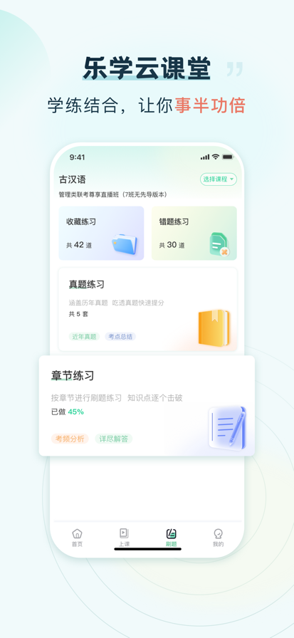 乐学云课堂是一款综合型的学习平台,随时随地听课,补充知识储备,让你遇到更大的可能。 应用介绍: 1、完善的科学课程体系:为用户提供海量实用的公开课程,快快滴让你快速掌握新技能。涵盖专业的成人自考、职业资格证书培训课程。让考试中的热点、难点、易错点一网打尽。完全解决你没有时间学习的问题,让你通过手机随时随地进行学习。 2、乐学课堂:精品高质量的录播课堂,高质量的授课内容,科学完善的系统体系,老师生动形象的系统讲解,解决你一切不懂的问题。 3、乐学题库:提供课程配套练习,依托智能评分系统,让你随时随地刷题,提升学习效率! 4、乐学资源:学习资料应有尽有,支持下载,下载后可以通过手机浏览,或打印出来,让你把知识牢牢掌握住! 不断追求与服务用户是我们乐学团队的宗旨!