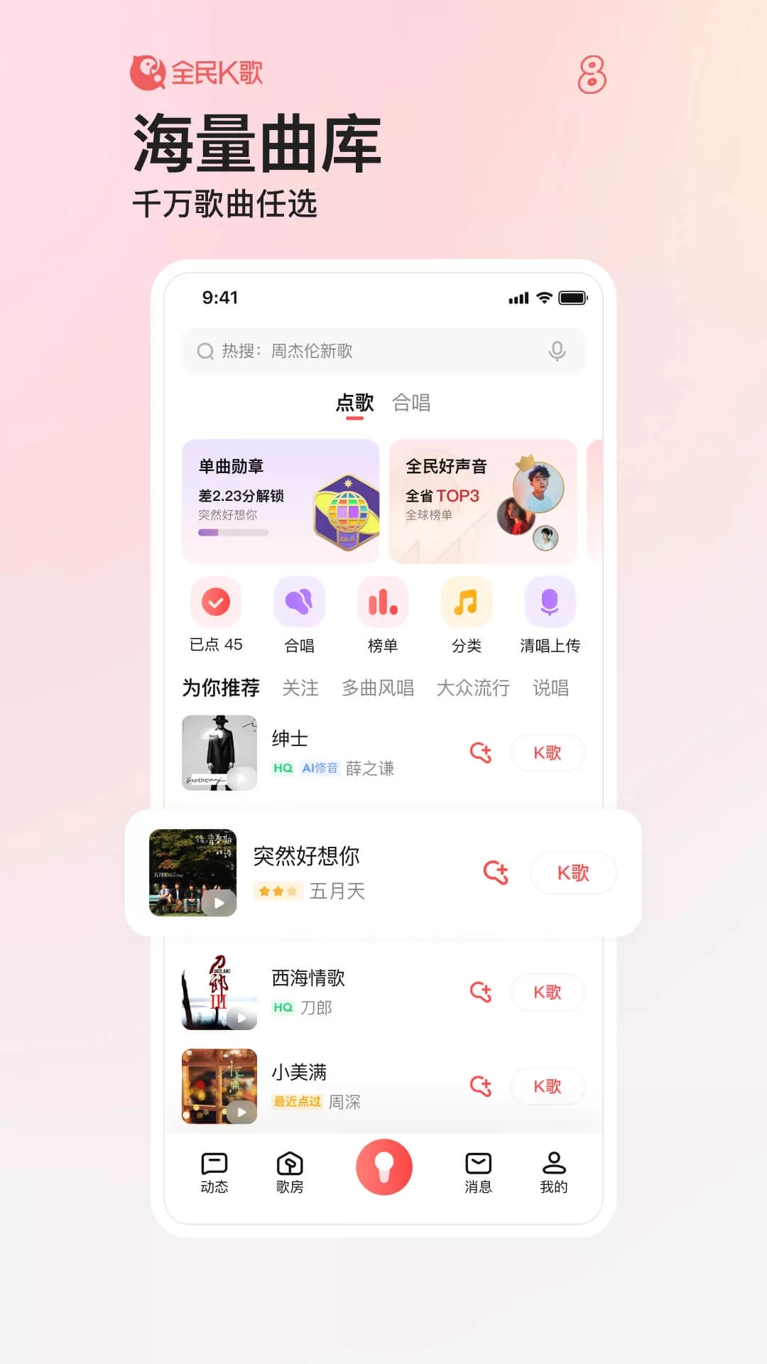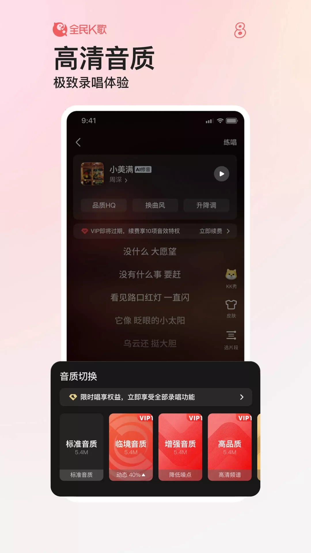 【腾讯官方唱歌交友平台,8亿人的首选】 - 随时随地轻松创作,让你的舞台,被全世界看见 - 海量高品质伴奏曲库,新歌热歌一网打尽,你想唱的这里都有 - 合唱:与天南地北的朋友唱同一首歌,更能与明星同框出演 - 直播:好看、好听、好玩的人都在这,还能自己当主播跨房间PK - 总有你喜爱的表演方式 【歌房群聊:畅聊斗歌,在线交友】 - 歌房:欢唱交友玩游戏,实时互动趣味多 - 群聊:作品交流互相赞,轻松遇见新歌友 - 抢麦:抢唱歌曲拼手速,看看谁是小曲库 - 家族:以歌会友是缘分,天下歌友一家亲 - 声动合唱:双人匹配实时合唱,互相亮灯无限唱聊 【K歌王者:在线1对1PK】 【作品下载/分享:支持下载为视频】 【全新音效:完美歌声,一键打造】 - 录歌:KTV模式升级,全屏MV大字歌词唱歌更爽 - 音效:新音效来袭,让歌声更动听 - 调音台:智能修音黑科技,唱好唱准更容易,逐句精修由你把控 - AI练唱:人工智能带你领略歌唱技巧 - 智能和声:和声效果美感再升级,综艺节目现场特效为你加持 【更多精彩】 - TV投屏:支持作品投射到电视播放,全家共赏美好时刻