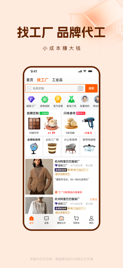 【阿里巴巴1688简介】 阿里巴巴1688是专业的B2B电商批发采购平台,云集了大量的淘宝卖家、天猫商城卖家、微店卖家、微商卖家、千牛用户、旺旺卖家(旺信)、线下致富创业开店者,义乌购批发卖家,通过手机下载阿里巴巴APP也可帮助微商、微店网购识货挑货,招商加盟,支持一件代发,服装批发等业务。用户可在平台上找到各种品类货源(时尚女装、男装、母婴、家装建材、玩具、家居用品、日用百货、手机壳批发等)。 【1688特色】 拥有各式各样的淘宝、天猫商城、苏宁易购等电商购物平台卖家货源,源头好货,新品快订任您挑选,一键识货挑货,是您的商机助理,寻源进货好帮手,也提供政府采购货源,商家支持旺旺、阿里邮箱沟通,手机旺旺(旺信)同步在线。 【找货神器-批发找货源的好帮手】 1688批发网开发的找货神器是为各大电商平台(支持海外电商平台)卖家提供一键找货源的工具,在APP上可以将看到的衣服或者商品图片保存到手机本地,然后用APP上的图片找货源功能在1688上找到同款或者相似款的批发货源 丰富货源:各大电商平台同款货源对接 利润更优:优质货源利润保障 每日更新:货源日日新鲜送达 精准匹配:大数据精准挖掘 方便快捷:省时省力找货无忧 【母婴货源市场】 1688母婴货源市场拥有孕期必备的孕妇装、孕妇内衣、防辐射服,宝宝婴儿期的纸尿裤、隔尿用品、湿巾,宝宝喂养需要的奶瓶、奶嘴、暖奶器以及宝宝洗护必备的宝宝护肤品、婴儿浴盆、驱蚊防蚊等货源。母婴类淘宝店主疯抢的热销好货这里都有,而且微商或者母婴店家都可以一件代发,全场包邮。 【买家核心功能】 为买家提供了一件代发,微店商家代发,淘店优选,快速补货,伙拼,实力铺货,1688直播,好货推荐,进口货源,热门市场,电商头条,新闻资讯,商友圈, 生意经等批发采购场景。覆盖全行业:电子元器件,工艺礼品,宠物园艺,家装建材,机械,食品饮料,餐饮生鲜,橡塑制品,家纺家饰,内衣,童装,安防,电工电气, 个人防护,五金工具,仪器仪表,照明,箱包皮具,母音用品,玩具,包装,鞋靴,美妆日化,汽车用品,日用百货,办公文教,男装,运动户外,3C数码,女装,配饰, 家用电器,纺织,化工,冶金 1)全新精品货源市场 2)微商分销实现快速铺货 3)手机更优惠,利润赚翻天 4)进货专属服务 贴心无微不至 5)全新操控视觉体验 选择一目了然 【热门货源批发类目】 1)服装批发 2)手机配件批发(如手机壳批发) 3)母婴用品批发 4)日用百货批发 5)机械五金批发 6)运动户外批发 7)鞋靴批发 8)工艺品批发 【微店、微商批发供货介绍】 1)0成本做微商,一件代发/拒绝囤货 2)甄选商家,特色货源 货源端:微供独家,源厂货源,进口货源,淘宝无同款商品 商家端:从1688商家中甄选源头优质一手货源,长期提供优质售前售后服务 【淘货源】 淘货源是针对淘宝卖家的一站式货源服务平台,为千万淘宝卖家提供经销、代销及批发、订货的组合式货源服务,同时帮助供应商建立向淘宝零售市场进行货源分销的电子化渠道网络。 1、以产地货源为核心,构建淘宝特色货源市场; 2、提供买卖双方便捷的传淘宝工具、自动分账交易及库存同步等渠道管理工具 3、面向买家提供平台管控的基础风险服务保障机制等,围绕买家塑造特色的市场服务标准。 【联系我们】 官方微博:阿里巴巴1688 官方网站:www.1688.com 联系方式:4008001688 您对App的反馈对我们很重要,如果您有任何问题或建议,欢迎致电联系我们
