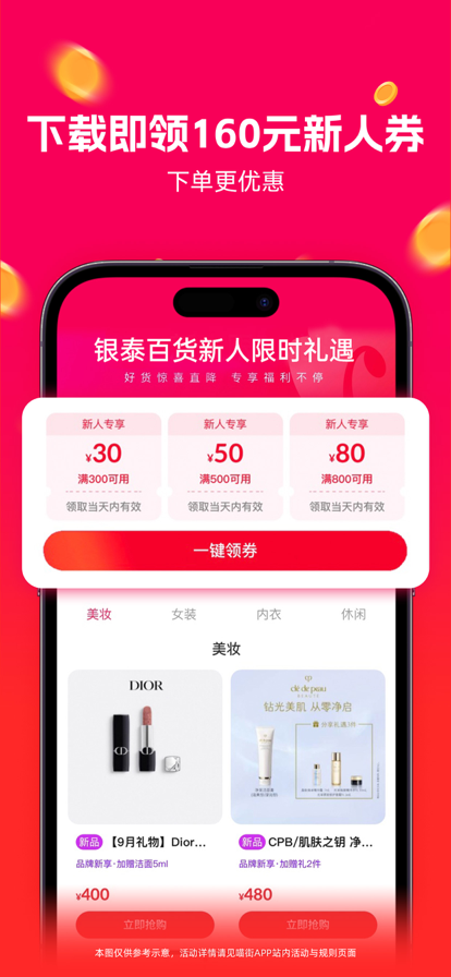 【关于喵街APP】 喵街APP是银泰官方线上购物平台,足不出户享受银泰专柜正品;大牌、尖货、潮品、轻奢,一站式满足消费者购物需求。喵街APP在手,让您随时享受专柜同款折扣! 【银泰承诺】 专柜正品:用户可在喵街获知门店及专柜信息,专柜电子小票,追溯商品物流信息,47家美妆品牌全国销量领先 专柜发货:银泰百货专柜发货并承担运费,购物零负担(特殊商品及个别专柜除外) 门店自提:喵街APP下单也可到银泰指定线下门店自提 超长售后:服装、鞋类商品自购买之日起60天内,不影响2次销售前提下可以退换(特殊商品及个别专柜除外) 跨门店退换货:喵街所购商品,满足退换货的前提下,可到就近银泰门店的顾客服务中心进行异店退换货 买贵赔:喵街商品支持品牌官方旗舰店比价,放心买,贵了银泰赔! INTIME365会员专享购物折上9折 【会员专享服务】 银泰商场楼层导航、品牌指南 停车缴费服务,免排队领取停车券 下单30天内电子发票一键申请(部分订单除外) 【INTIME365会员专享特权】 消费省钱,可享折上9折 更有停车、洗衣、洗车专属折扣等福利不定期更新 【活动福利】 1.新人专属百元礼 2.每日签到,天天领红包;更有品牌券、品牌到柜礼、餐饮权益月月上新! 3.天天双十一,每天11:11分开抢,好货限量限时折扣5折起! 4.找商品问活动,就找专柜导购!给柜姐留言或者拨打视频电话,多种方式邀您尝试~ 5.体验中心:银泰百货联合大牌商家等不定期举办线下活动,线上不定期开放限时体验名额 【联系我们】 感谢您对银泰的信任,以上所有权益/活动/服务,详情可登陆喵街APP查看,如果您有任何的意见或者建议,登录喵街APP-我的-客服,联系我们,我们会认真聆听您的声音~