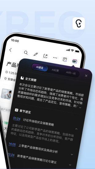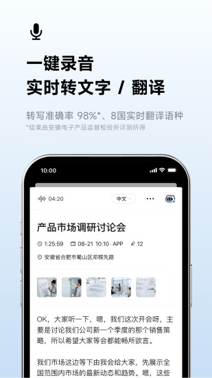 还在为信息记录处理的繁琐而困扰?讯飞听见APP,随身AI语音记录助手来帮你。搭载科大讯飞星火大模型技术,以强大AI实力助力工作学习提升效率。 在会议、演讲、学习、采访等多场景,打开APP开始录音,实时语音转文字、多语种翻译。录音结束后,无需手动整理,文本自动区分角色、划分段落、支持字音同步编辑、AI智能总结归纳、语篇规整,快速生成全文摘要,多格式分享等,让信息传递更高效。 无论是日常办公、授课演讲、媒体采访,讯飞听见APP都可以完美适配,满足录音转文字及翻译需求,开启智能办公学习的全新篇章。 【产品功能】 1、一键录音,实时录音转文字、语音翻译 ①录音实时转文字:准确率98%*,24种语言自由转写*。 ②多语种实时翻译:高效精准翻译,8国语言随心互译。 2、录音过程,重点标记、拍照辅助记录 ①记录过程中随时标记,不再遗漏任何重点。 ②一键拍摄或插入图片,让记录更全面。 3、录音间隙,随想随记 ①实时添加批注,记录迸发灵感。 4、轻松一刻,小窗悬浮字幕 ①追影视作品、听播客记录、看爱豆直播。 ②内录外录自由选择,再也不怕噪音干扰。