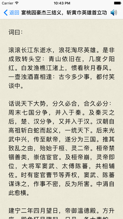 ---- 精确原文【有声】系列 ---- 1. 校对 对原文进行逐字校对,把出现错字的可能性降到最低。 2. 排版 对排版进行反复测试,对文本进行禁则处理、齐头尾、英文换行(hyphenation)等处理,达到舒服的阅读体验。 3. 可点读 点击右上角的喇叭则阅读选定的文本,不选定文本则阅读全文。再点击喇叭则停止声音。 ----《三国演义》简介----- 《三国演义》,全名为《三国志通俗演义》,中国第一部长篇历史章回小说。作者一般被认为是元末明初的罗贯中。虚实结合,曲尽其妙。明末清初文学家、戏曲家李渔有言曰:“演义一书之奇,足以使学士读之而快,委巷不学之人读之而亦快;英雄豪杰读之而快,凡夫俗子读之而亦快。”