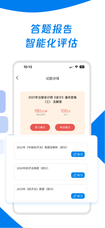 会计考试历年真题汇总,精选考题,超全考点,重点难点解读,助力备考,效率加倍!帮助考生从基础抓起,章节模拟精炼,考前必刷! 初级会计题库,中级会计题库,注册师会计题库,配套章节练习,课后及时巩固,扎实会计知识,帮助考生把知识点理解透彻.历年会计考试真题练习,再也不怕考试遇到不会的题目! 做题记录,错题集,个人做题数据详细记录,量身打造属于你的会计题库,查缺补漏全面掌握.