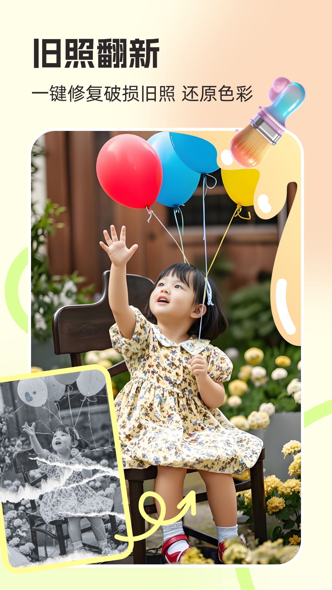智能修复老照片是一款能够智能修复老旧照片的实用app,老照片智能AI修复,立等可取。轻轻一点即可轻松修复老旧照片,还原照片原貌,重塑岁月的美好瞬间。<br><br>产品主要功能:<br>1、老照片修复<br>AI在线识别老旧照片上划痕、折痕、破损以及斑驳,智能修复旧照片,提升照片画面质感,恢复旧照片崭新样貌,让老照片重获新生!<br><br>2、黑白照片上色<br>老照片修复专业的AI上色系统,只需轻松点击即可为老旧黑白照片上色,精准还原场景、人物色彩,让照片更鲜活。<br><br>3、照片降噪、去雾以及过曝修复功能<br>可针对有瑕疵的照片进行修复操作,使照片更加精细精美!<br><br>4、照片编辑<br>内置智能的照片编辑功能,功能强大,效果好<br><br>5、人脸特效<br>内置多款精美的人脸特效滤镜,如漫画脸、变年轻、变老、性别转换等<br><br>6、一键抠图<br>智能的一键抠图功能,让您解放双手,一键抠出想要的人或物<br><br><br><br>更多精彩功能,欢迎进入app慢慢探寻!
