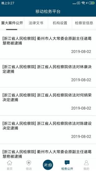 浙江检察app为全省律师提供在线阅卷、案件程序性信息、检察官约见、羁押必要性审查等功能。为公众提供控告、申诉、举报功能,件件有回复。为代表委员提供提案办理功能。详细功能如下: 一、律师服务事项(8项) 1. 案件绑定 2. 解除绑定 3. 案件空间 4. 证据衔接申请 5. 预约检察官申请 6. 提交法律意见书 7. 变更强制性措施申请 8. 线索移交 二、人大代表/政协委员服务事项(3项) 1. 代表委员专刊 2. 在线提案 3. 提案信息查看 三、检察机关人员相关功能(11项) 1. 案件绑定审批 2. 检察官预约审批 3. 证据衔接审批 4. 变更强制性措施审批 5. 法律意见书审批 6. 线索移送审批 7. 代表委员意见办理 8. 代表委员联络备忘录 9. 信访来件分流 10. 信访来件处理 11. 信访预约处理 四、公众服务事项(11项) 1. 重要案件信息 2. 法律文书 3. 机构设置 4. 网上信访 5. 信访预约 6. 处置查询 7. 法律文书模板 8. 网上课程 9. 12309热线 10. 法律法规 11. 司法辅助信息