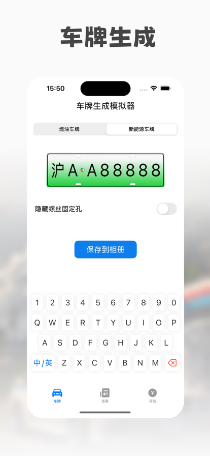 欢迎使用车牌模拟生成器!我们为您提供了一款高效专业的工具,涵盖了燃油车牌、新能源车牌和摩托车牌的模拟生成功能。不论您是需要个性化车牌还是进行车牌归属地查询,甚至是实时违章查询,我们都能满足您的需求。 主要功能包括: - 车牌模拟生成:快速生成符合规范的燃油车牌、新能源车牌及摩托车牌。 - 车牌归属地查询:准确查询车牌号对应的省市信息,帮助您识别车辆来源。 - 车牌号合法性校验:即时验证输入车牌号是否符合法规标准,避免不必要的麻烦。 - 违章查询:实时查询车辆违章记录,助您及时掌握车辆使用情况。 我们致力于为用户提供便捷、可靠的服务体验。无论您是车主还是行业专业人士,我们都能为您提供理想的解决方案。 立即下载车牌模拟生成器,体验高效、专业的服务吧! 订阅说明 • 您可以通过应用内的购买页查看相应的订阅价格, 升级并解锁我们的所有功能. • 付款:用户确认购买并付款后记入iTunes账户 • 续费:购买连续包月的会员账号,苹果iTunes会在到期前24小时内扣费,扣费成功后订阅周期顺延。 • 取消续订:如需取消续订,请在当前订阅周期到期前24小时以前,进入“iTunes Store与App Store”,点击“Apple ID”,选择“查看Apple ID”。进入“账户设置”页面,点击“订阅”,选择对应的订阅项取消即可。 隐私政策: https://docs.qq.com/doc/p/e9ede505fb370da3b058dc322cb9a6f598196ac4 用户协议: https://docs.qq.com/doc/p/316fdae0ce14c5090996bcd6ac43b21c2f7ebeb1