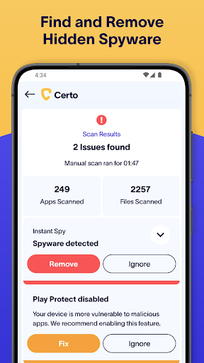 强大的防护功能,有效防御间谍软件、病毒、黑客以及在线监控。<br><br>Certo AntiSpy 是您保护移动隐私和安全的一体化解决方案。无论是恶意间谍软件、侵入性应用还是不安全的网络,Certo 都能全天候保护您的设备和个人数据。<br><br>加入数百万信赖 Certo 检测和清除威胁、保护隐私并持续在线安全的用户行列。<br><br><u><b>主要功能:</b></u><br><br>★ <b>间谍软件检测器</b> – 查找并删除隐藏的间谍软件和跟踪软件应用。<br>★ <b>防病毒扫描程序</b> – 扫描您的设备,查找病毒、木马和其他威胁。<br>★ <b>隐私保护</b> – 发现监控您通话、消息或位置的应用。<br>★ <b>安全健康检查</b> – 识别可能导致手机易受黑客攻击的设置。<br>★ <b>实时保护*</b> – 全天候防御,提供定时深度扫描和即时威胁检测,有效防范新应用入侵。<br>★ <b>VPN*</b> – 使用军用级加密技术保障您的网络连接安全,让您在任何网络上匿名浏览。<br>★ <b>入侵检测*</b> – 如果有人试图访问您的手机,我们会静默拍照或触发警报。<br>★ <b>违规检测*</b> – 检查您的账户或密码是否已泄露到暗网。<br>★ <b>无广告</b> – 享受无缝衔接、无广告的安全体验。<br><br><u><b>功能详情:</b></u><br><br><b>间谍软件和病毒扫描程序</b><br><br>保护您的设备免受间谍软件、病毒和危及您隐私的应用的侵害。凭借先进的威胁检测功能,Certo 确保您始终受到保护——即使新的风险出现。<br><br><b>隐私保护</b><br><br>找出哪些应用可以访问您的位置、联系人、消息、照片、麦克风或摄像头,重新掌控您的隐私。<br><br><b>安全健康检查</b><br><br>领先黑客一步。Certo 会检查您设备中是否存在不安全的设置,并帮助您立即保护它们。<br><br><b>实时保护</b><br><br>我们升级的实时保护功能确保您始终领先恶意软件一步。Certo 每 24 小时自动执行一次全面深度扫描,并检查您安装的每个新应用是否存在隐藏威胁——无需您动手。*<br><br><b>安全 VPN</b><br><br>使用军用级加密保护您的在线活动。Certo VPN 可在任何 Wi-Fi 或移动网络(即使是公共网络)上确保您的网络连接安全,并保护您的数据隐私。匿名浏览,远离窥探。*<br><br><b>入侵者检测</b><br><br>我们独特的入侵者检测系统可在无人看管时保护您的设备。检测到有人试图猜测您的 PIN 码或访问您的手机,并拍摄入侵者的静默照片或发出警报。*<br><br><b>违规检查</b><br><br>每年有数十亿的凭据在数据泄露中被泄露。使用 Certo 查明您的帐户是否遭到入侵,并保护您免遭身份盗窃和欺诈。*<br><br><b>无广告体验</b><br><br>我们认为您的隐私是第一位的,因此没有烦人的广告。Certo 100% 无广告,为您带来简洁、专注的体验。<br><br><br>* 升级以获取高级保护功能。包含 7 天免费试用。<br><br>保护您的隐私是我们的使命。<br><br>立即下载 Certo,体验强大且易于使用的保护,抵御间谍软件、病毒和数字威胁——现在还配备安全的 VPN 和实时应用扫描。