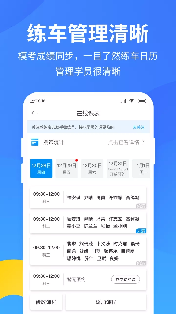 教练宝典是由驾考宝典原班人马打造的一款为驾校及教练量身定制的集招生、教学、管理为一体的全新产品,致力于真正帮助驾校及教练解决招生难题、并提升教学水平和服务质量,是国内业内领先的教练必备工具,驾考宝典行业领先的庞大用户量让驾校教练招生更方便简单,生源从此不用愁! 【语音播报】 开辟了科目二、科目三语音播报,教学大纲等新兴栏目,还有提供科目二语音播报、科目三线路模拟、科三语音播报功能,动动手指就可以自动完成考试指令,教练宝典让教练们用更轻松的方式完成工作! 【驾校招生】 教练入驻教练宝典,可以随时收到从驾考宝典来咨询学车的学员信息,驾考宝典拥有千万学员,真正做到帮驾校解决招生的问题。 【预约练车】 教练发布练车日程,学员一键预约,练车日程一目了然。省心智能管理,实时通知学员考试安排,及时掌握考试结果。 【口碑宣传】 驾校教练可以一键生成微驾校名片,随时随地分享到微博,微信,空间等社交平台,让教练员足不出户,宣传自己的品牌。 ——联系我们—— 官方网站:www.jiaxiaozhijia.com 微信公众号:教练宝典 对我们产品有任何意见,欢迎拨打教练宝典客服电话:400-668-7027